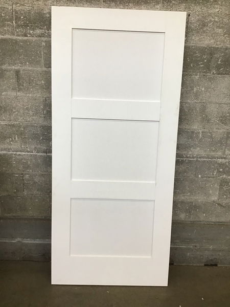 Undrilled primed masonite, Shaker style three panel interior door. Although this door is exterior thickness, primed masonite is not intended for weather. Item may have cosmetic damage.  Photo may be representational.