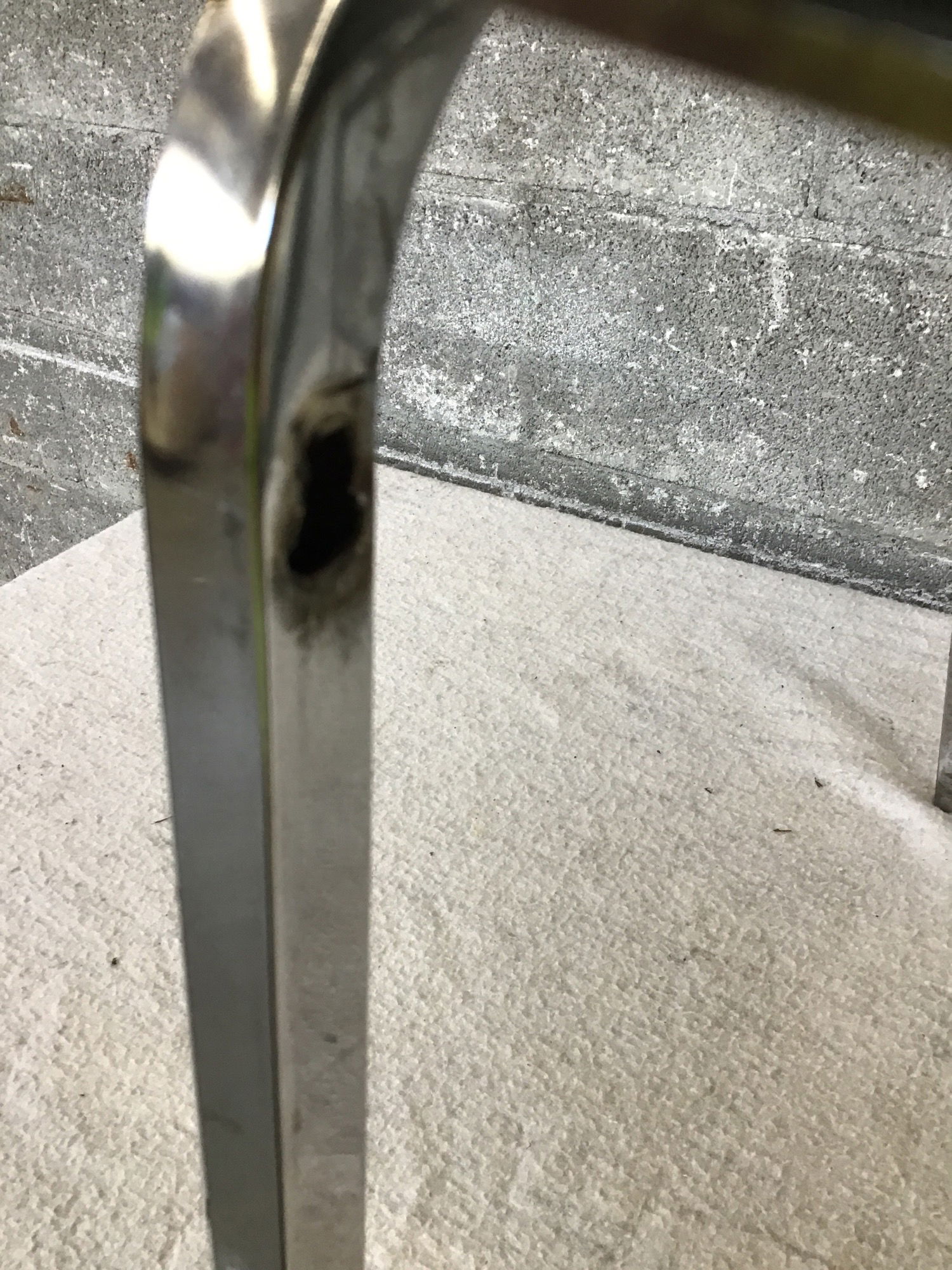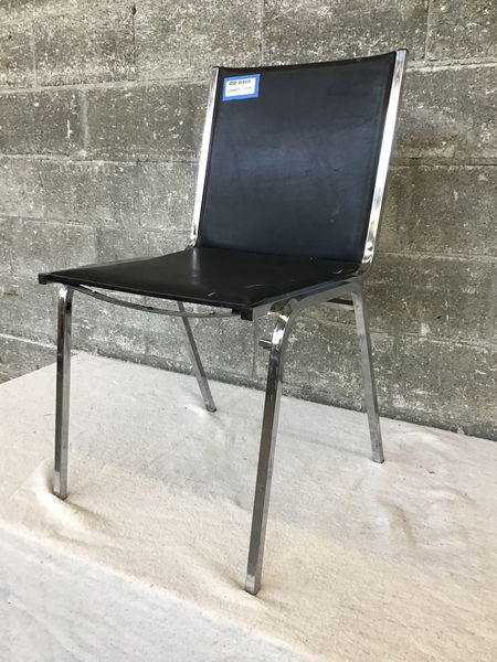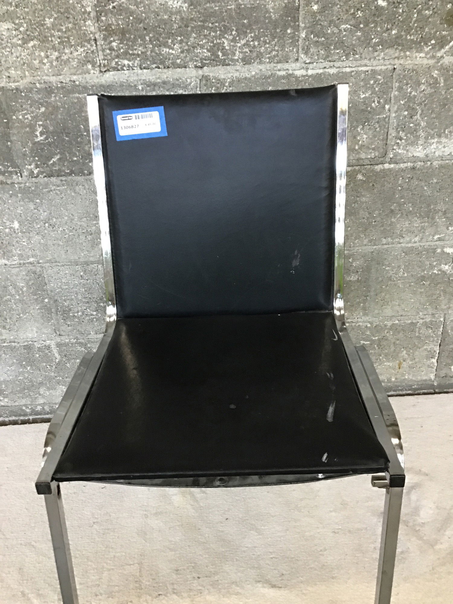 Chrome finished steel chair with a soft faux leather black upholstery. This chair was most likely a waiting room chair, but its certainly ready for you to rest your aching sits bones. Front spreader bar is missing (see third photo). Price reflects.