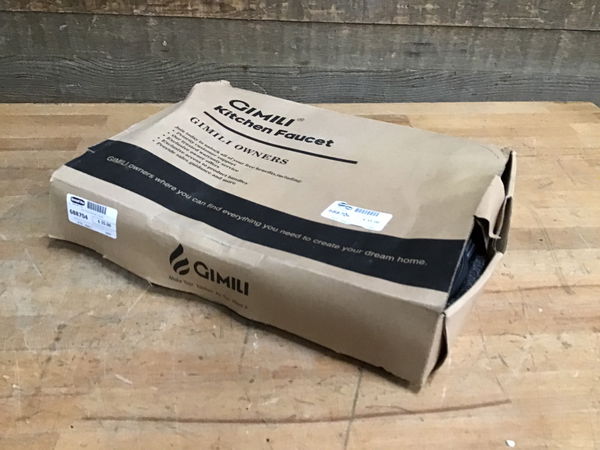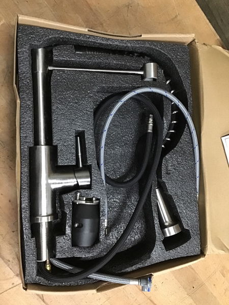 Used Gimli brushed nickel finish kitchen faucet. Looks to have some small cosmetic imperfections from use but in decent shape with installation manual and parts.