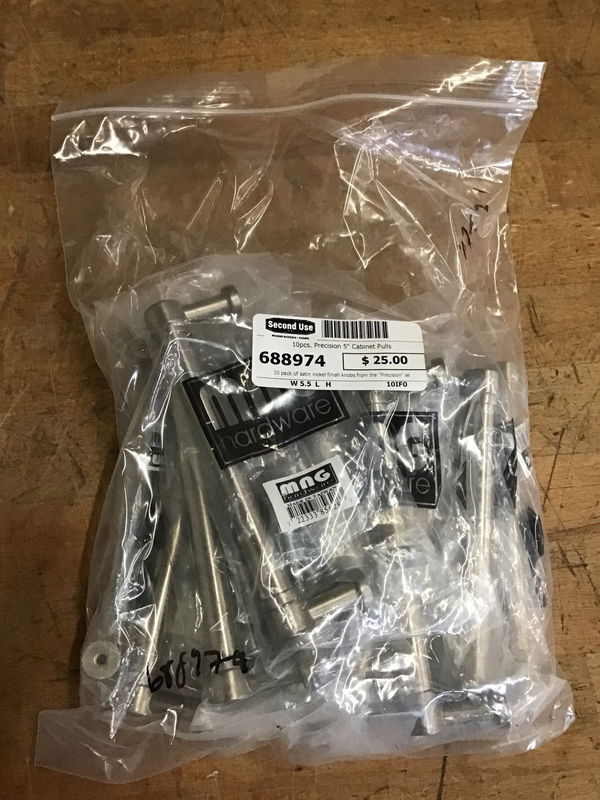 10 pack of satin nickel finish knobs from the "Precision" series by MNG hardware. 5" center to center and still in packaging. We may have other matching hardware in this series in stock here!
