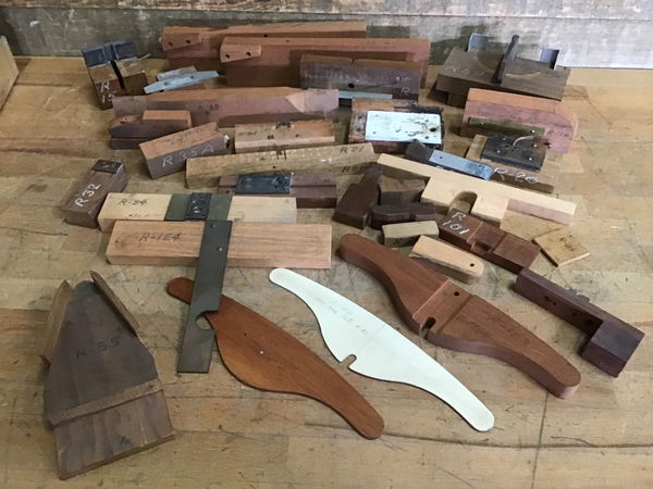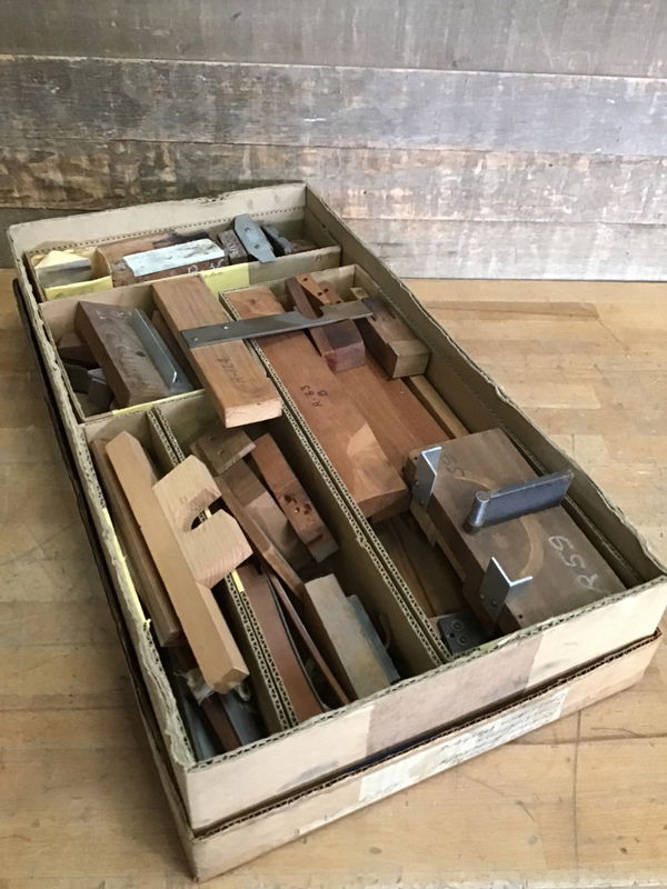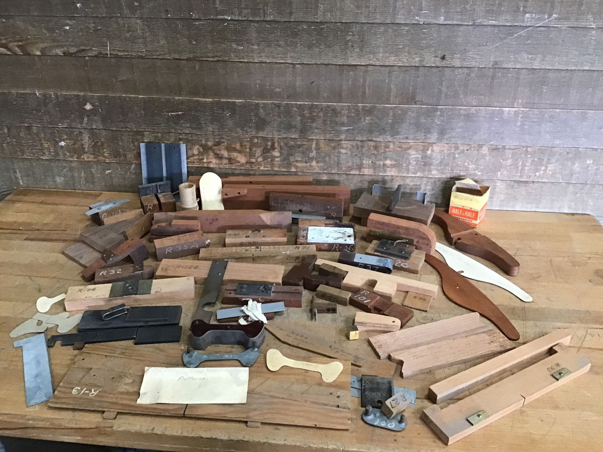 This is a box of vintage rudder parts jigs, samples, other hardware/tools originally used in the construction of canoes. Looks like there are some nice little wood chunks in here including cedar, mahogany, and other hardwoods, all from the Willits Brothers original shop. Great for projects other than boats!