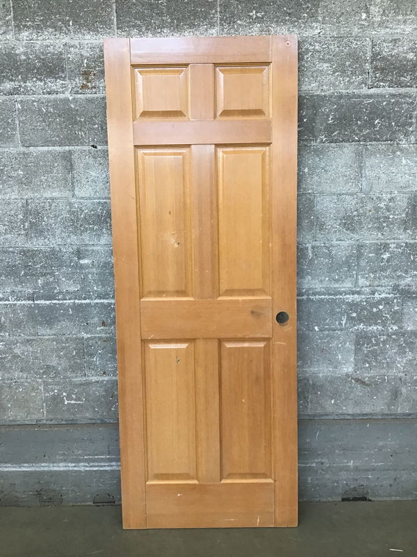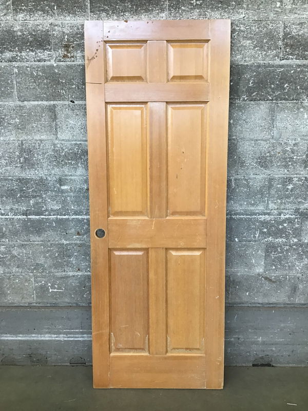 Raised six panel interior door with a yellowish stain that is wearing in spots, and there are some dings and other wear presenting. Consider this a paint grade door that will need some work (maybe some wood filler/putty and sanding) before painting. Price reflects.