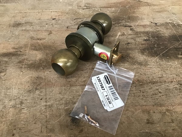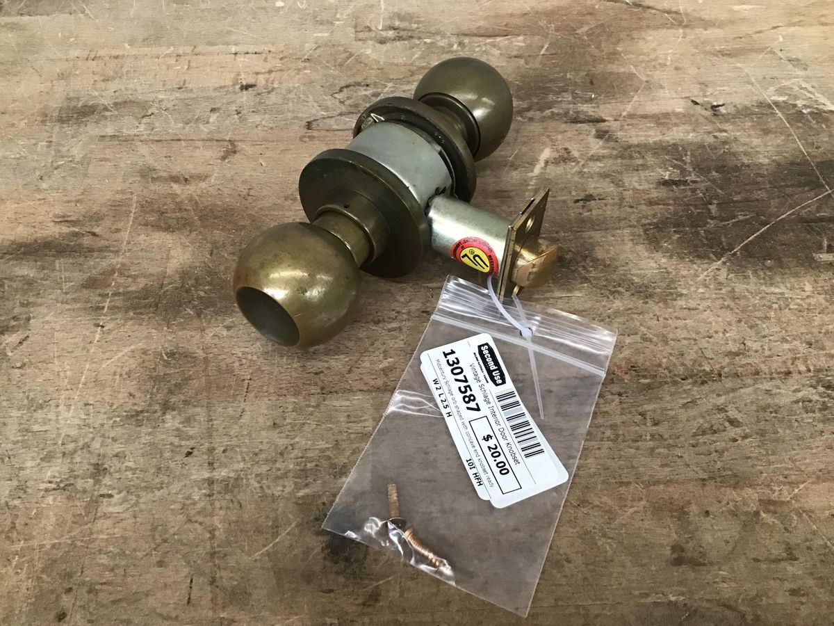 Midcentury Schlage orb shaped with concave end knobset ready to reinstall except for a strike plate. The antique brass finish shows minimal signs of wear. Screws for the 2 /4" backset latch are in the plastic bag. This is Schlage's higher end knobset for the 60's and early 70's. I believe it's a Grade 1 knobset, if that makes sense to you.