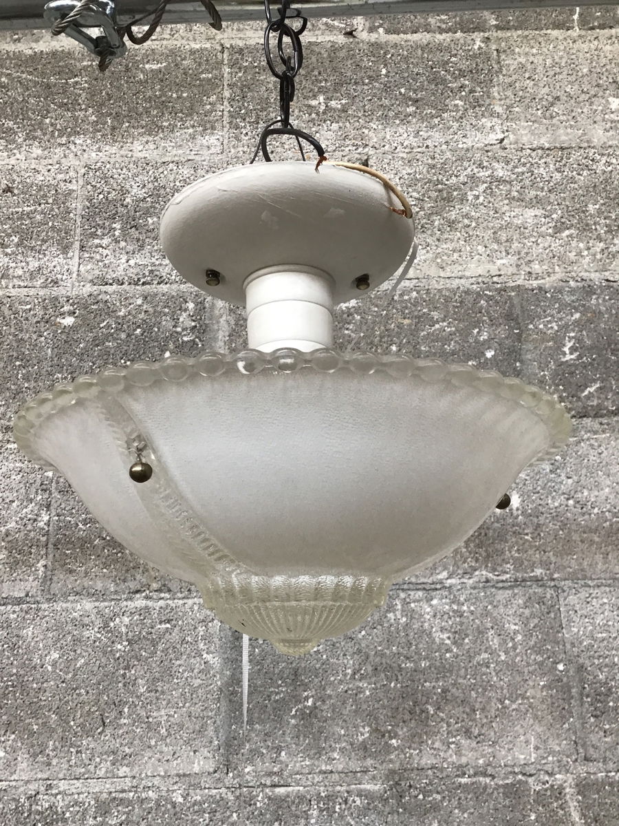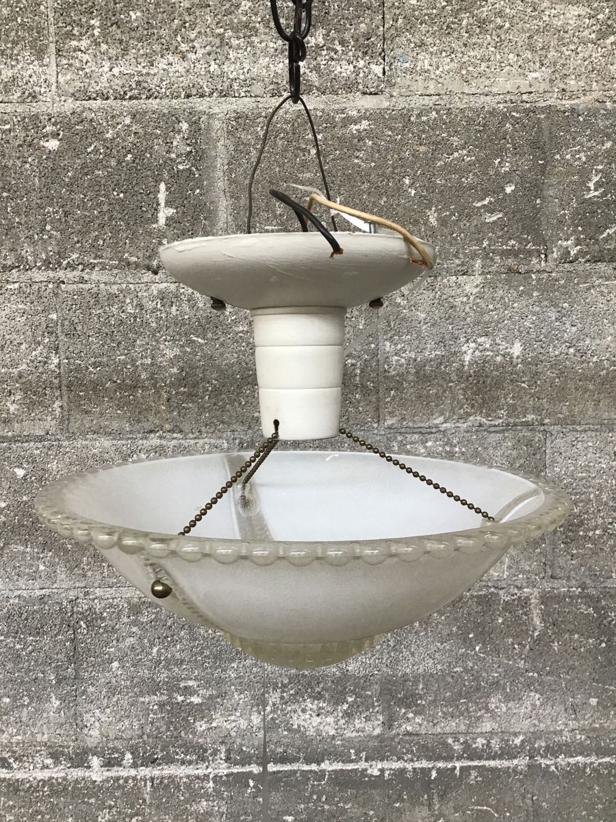 Lovely vintage bedroom light with painted white fitter, newer wiring and a three-chain shade.