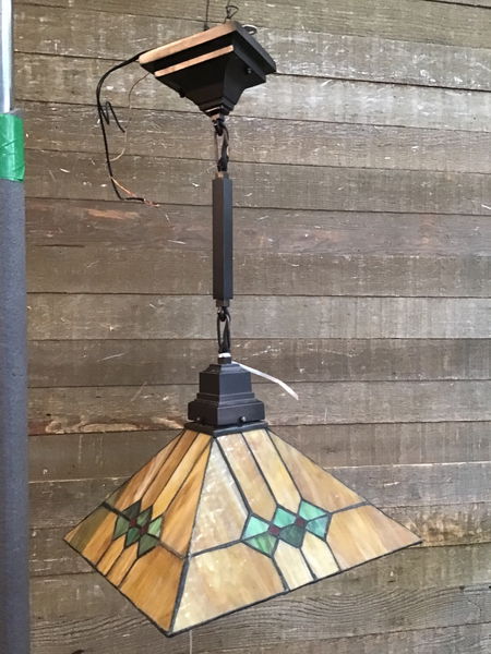 Stained glass pendant light in good used condition. Features burnt orange, green, and red slag glass panes. Wiring looks great, though we always recommend a full test prior to installation.