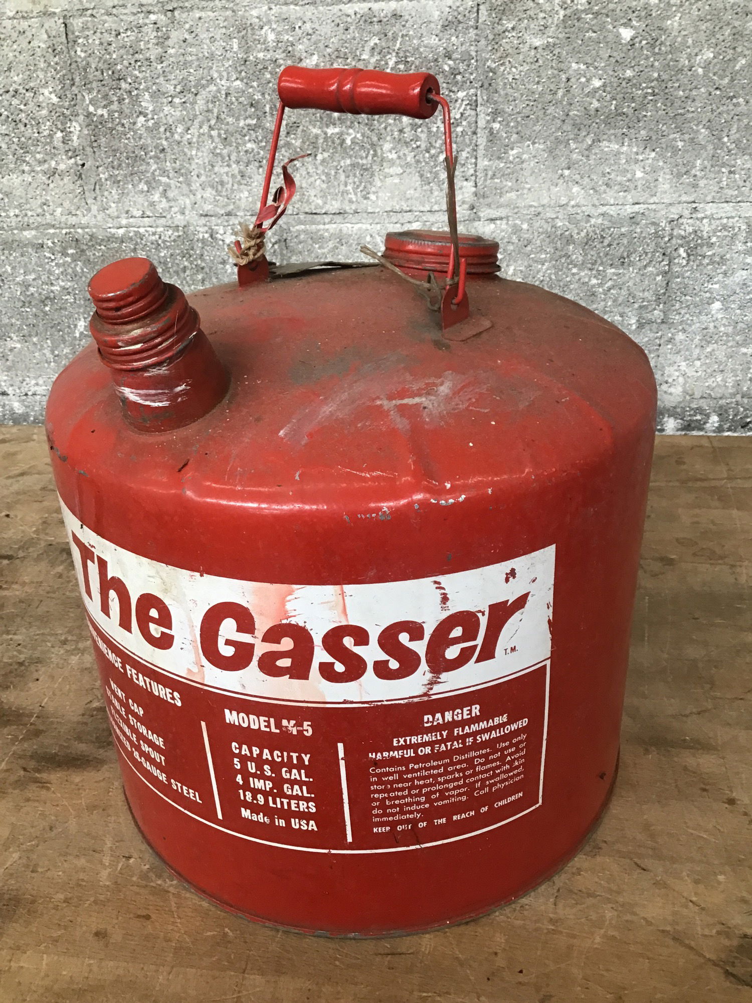 Vintage Eagle brand galvanized gas can. Painted red and comes with handle. Paint has a weathered patina.