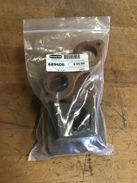 This is a bundled set of vintage Willits Brothers parts with two heavy duty bronze fasteners of some kind with internal threading on each, as well as two distinct wooden casting molds originally used in canoe construction. This comes from Tacoma's own Willits Brothers Canoe Co. Makers of a highly sought after "double planked" canoe design that was constructed until the mid 60s. Very cool piece of Pierce County industrial, and canoe building history. Now ready to help bend some wood planks or even composite decking material. Learn more about it here! Please note that several Willits experts reviewed the material as items from the workshop that were not critical to telling the story of the Willits Brothers (hence why we have it and not the museum). Most of their collection is in the museum's property now.