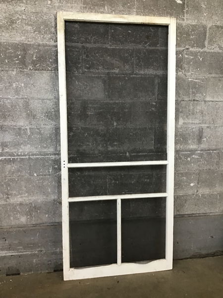 A wooden screen door with a weathered white paint job. The screen is coming up in spots and I could use a good wipe down, paint touch up and a new screen.