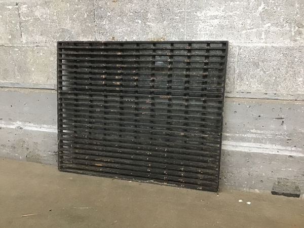 Solid oak grate with a dark stain on one side. Little dirty but it'll clean up.