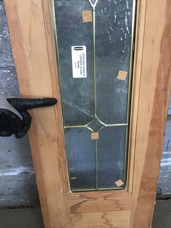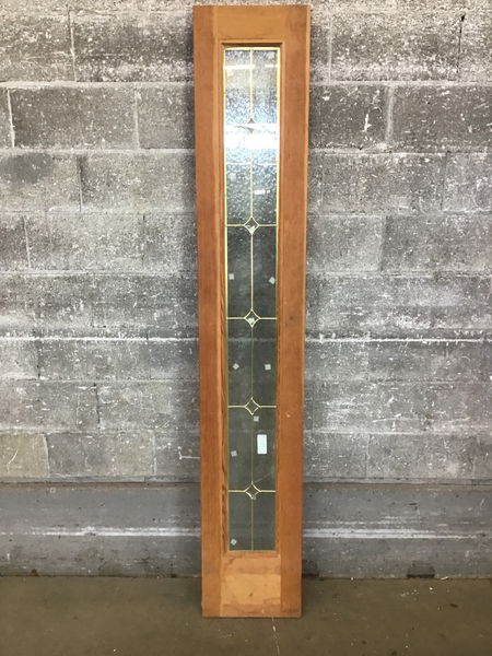 Unfinished fir leaded, insulated glass side lite (brass caming). There are some water stains on the fir veneer and a crack in the leaded glass panel which is encased in the insulated glass. Price reflecsts.