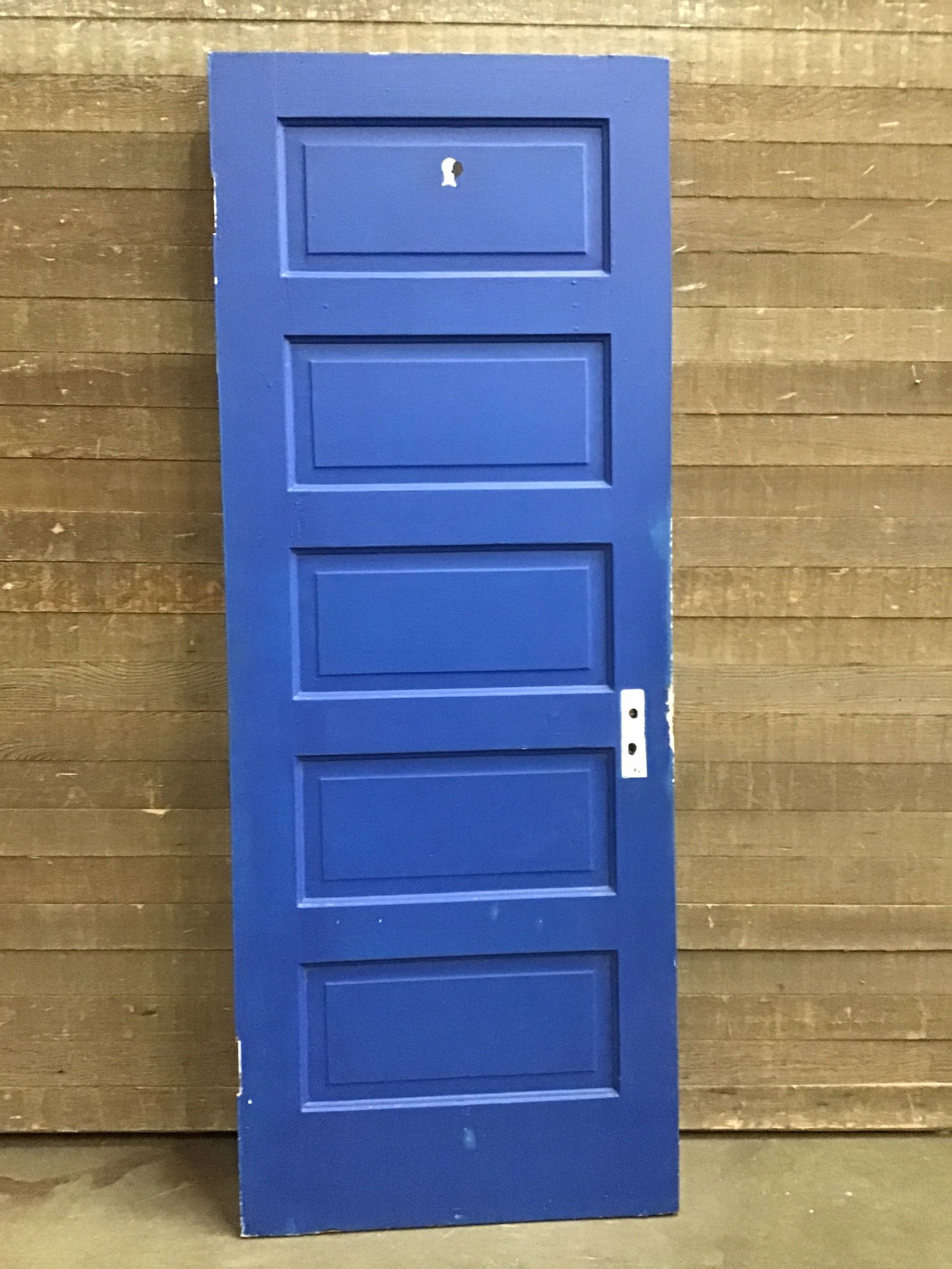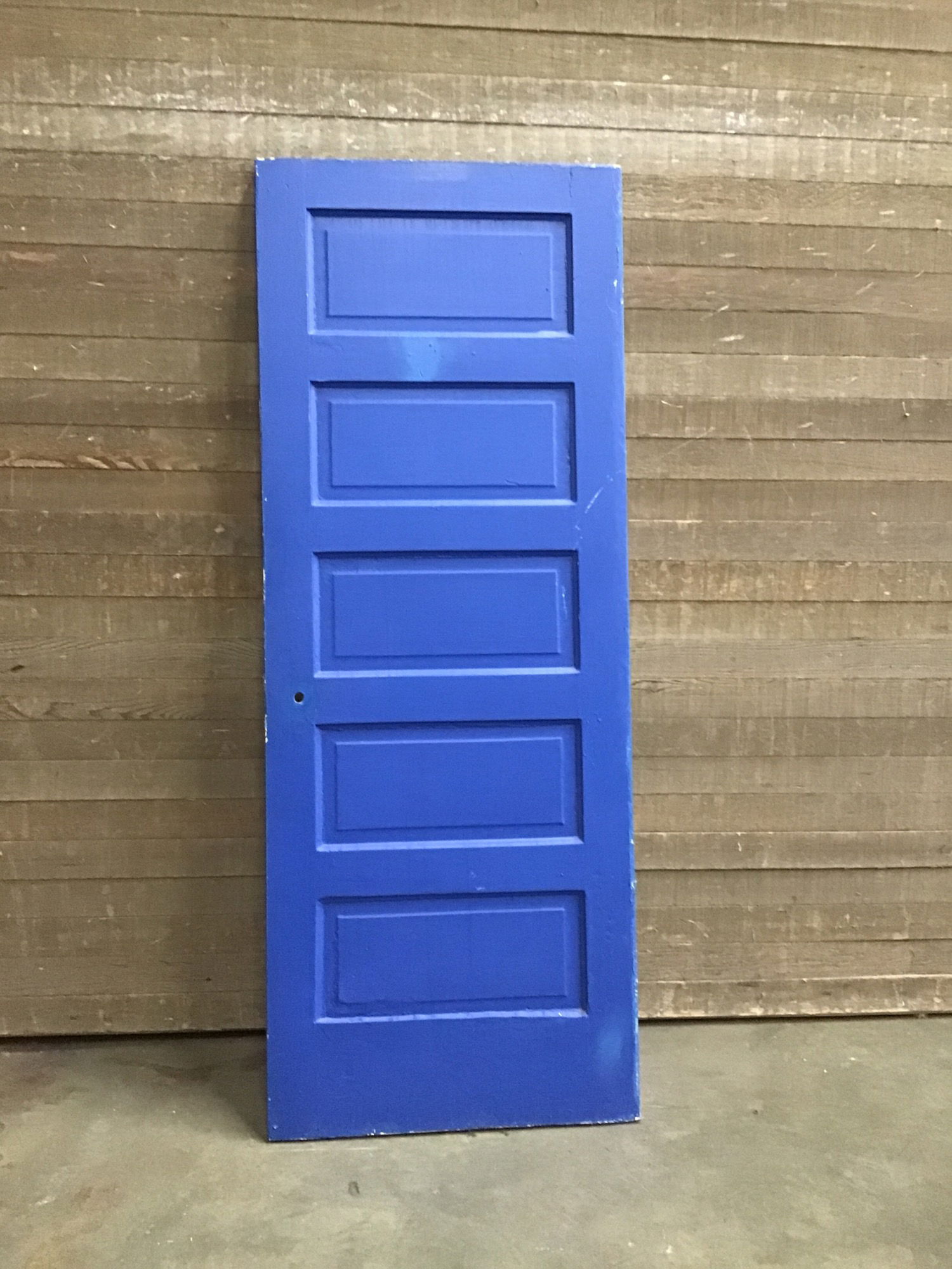 Vintage Five Panel Interior Door. Solid wood construction and heavily painted with the last coat being a very blue paint. Price reflects condition.