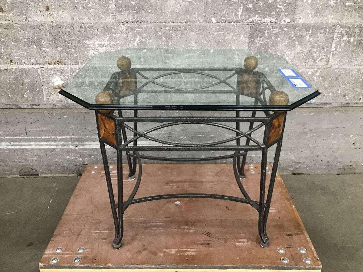 Metal table base with accents that look to be made of lacquered wood and a glass top. Glass has a decorative finished edge for added detail. Would look great in a living room or even a covered outdoor area.