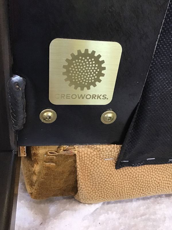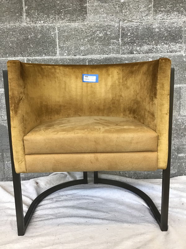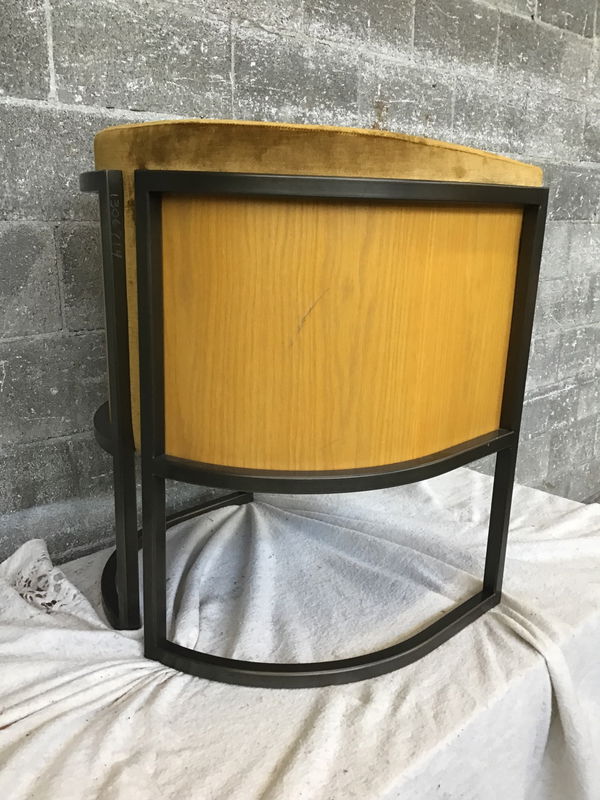 This is a custom built mod lounge chair made by local furniture company Creoworks. The frame is steel with an oil rubbed bronze finish. Their chair itself is in a U-shape and features a burnt orange upholstery.