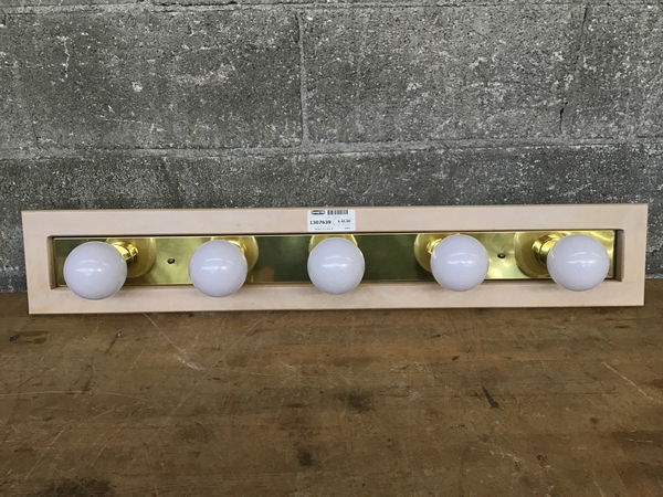 A classy vanity light with a brassy canopy, all held within a custom-built white oak frame. It sports five globe bulbs.