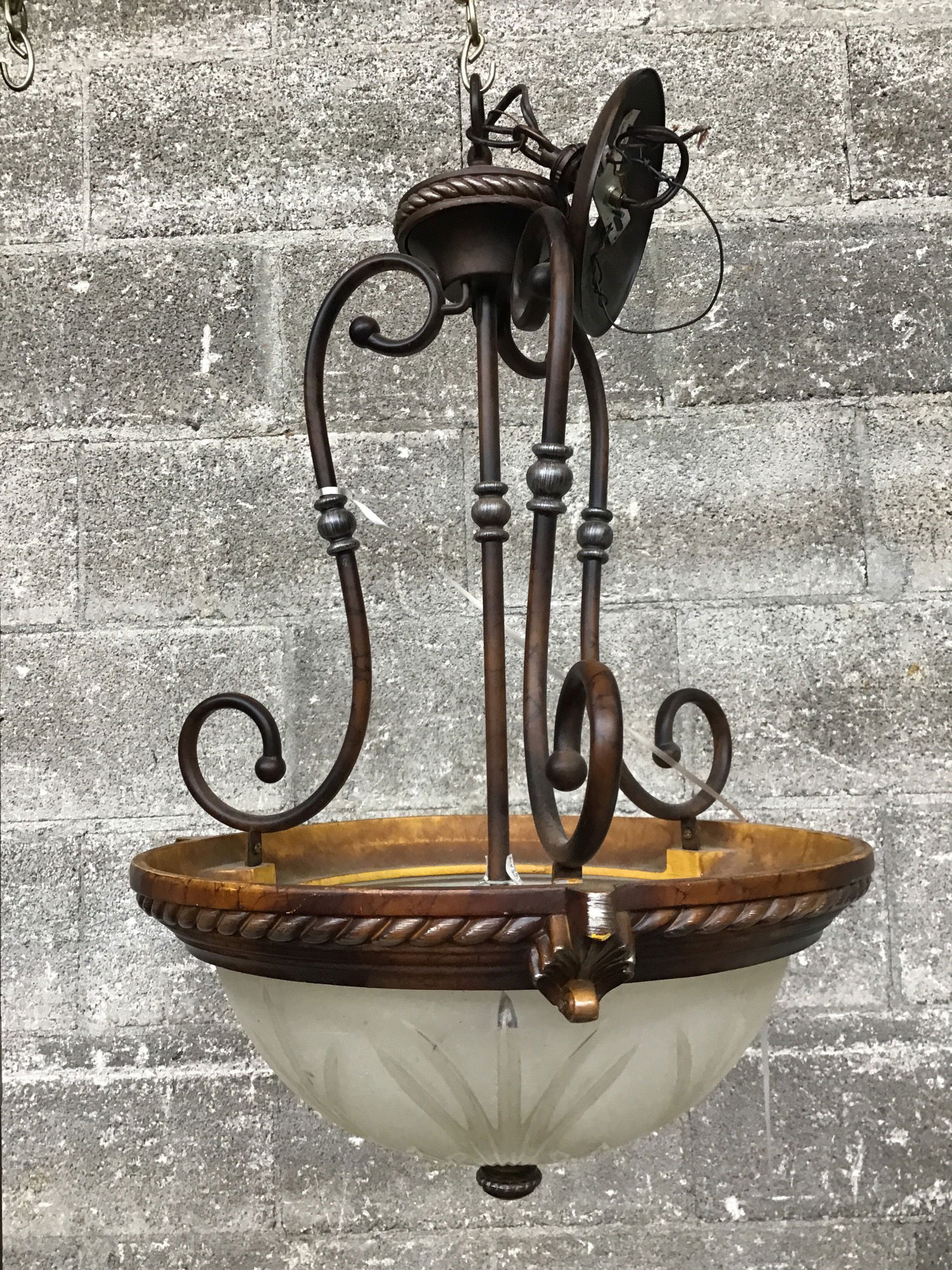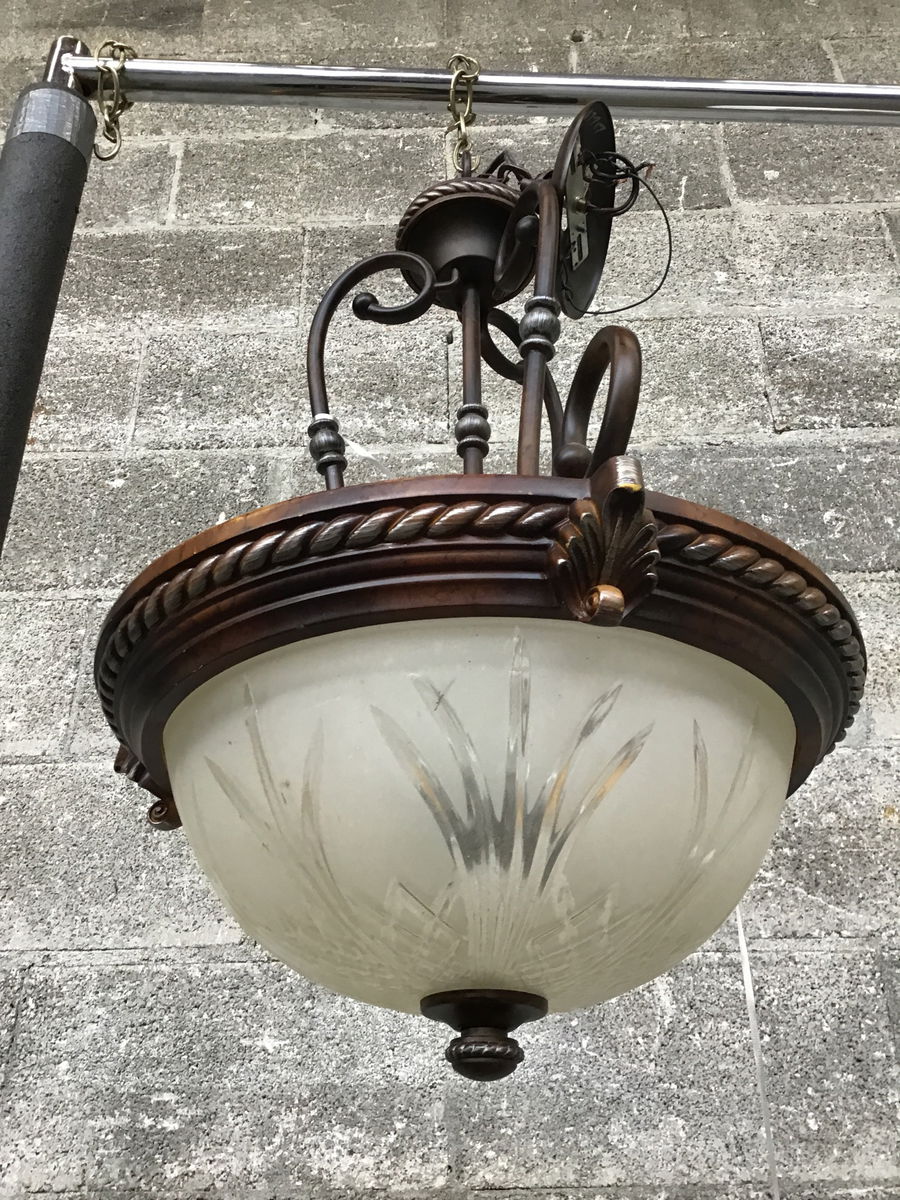 A three-bulb chandelier with Tuscan stylings, including the construction being finished with a kind of cross between antique brass and darkened faux-marble and an etched glass bowl fitter.