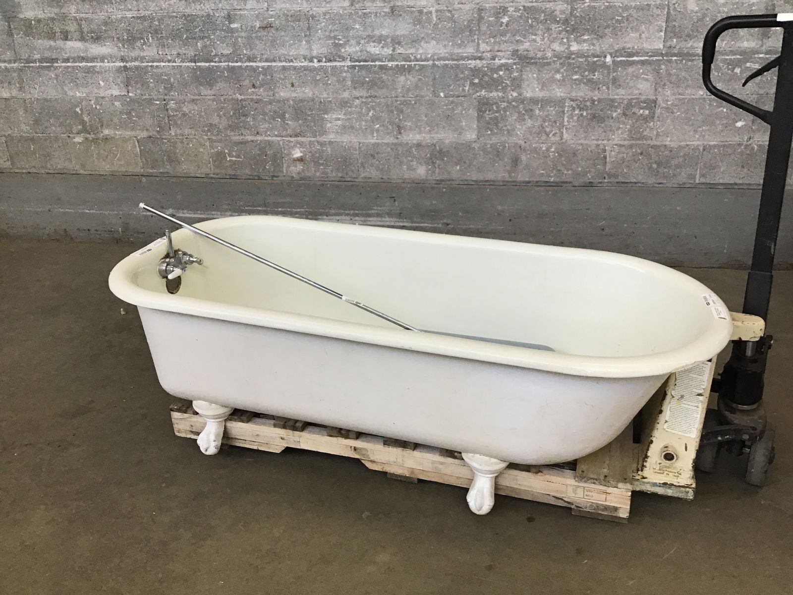 You're getting a little good with a little bad here. The tub has some worn glaze around the high traffic down spout area, but the rest is nice and glossy; original not refinished. There are a few small pock marks around the brim but no big gouges or sharp chips. The big issue is the two non-painted "back" feet are broken. The casing broke at the tub mount (included but a tough repair). Keep this a left hand tub, prop up the back on some bricks and send 'er bud!