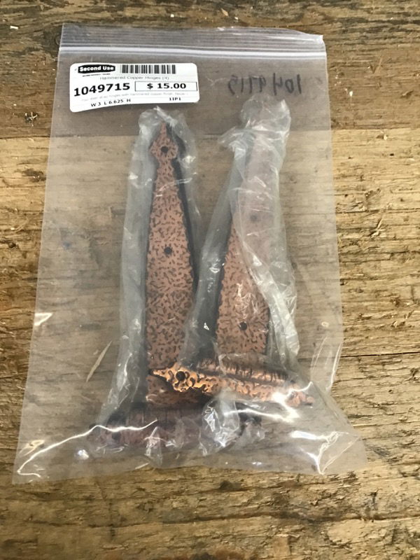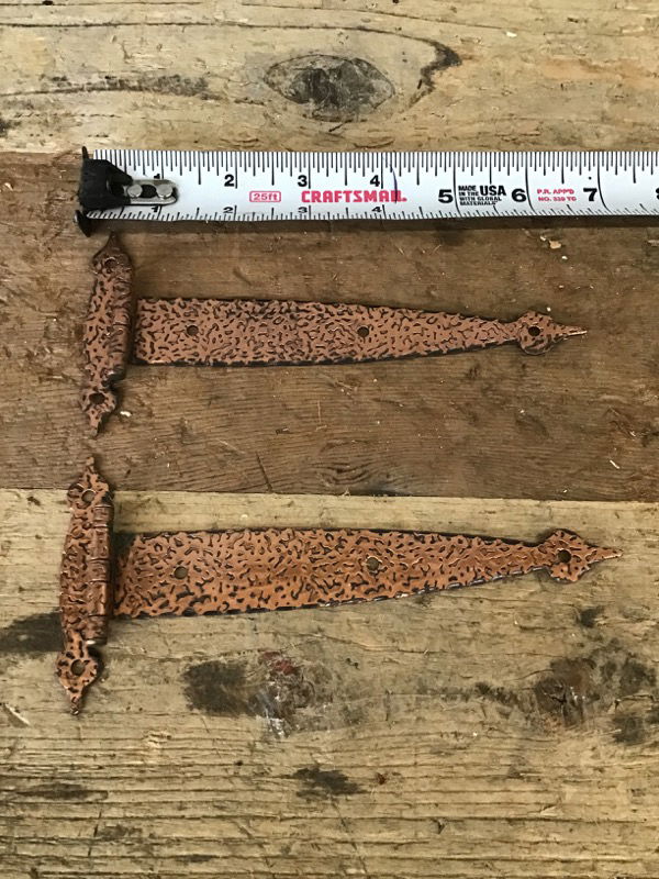 Four steel strap hinges with hammered copper finish. Never installed before. Installation screws included.