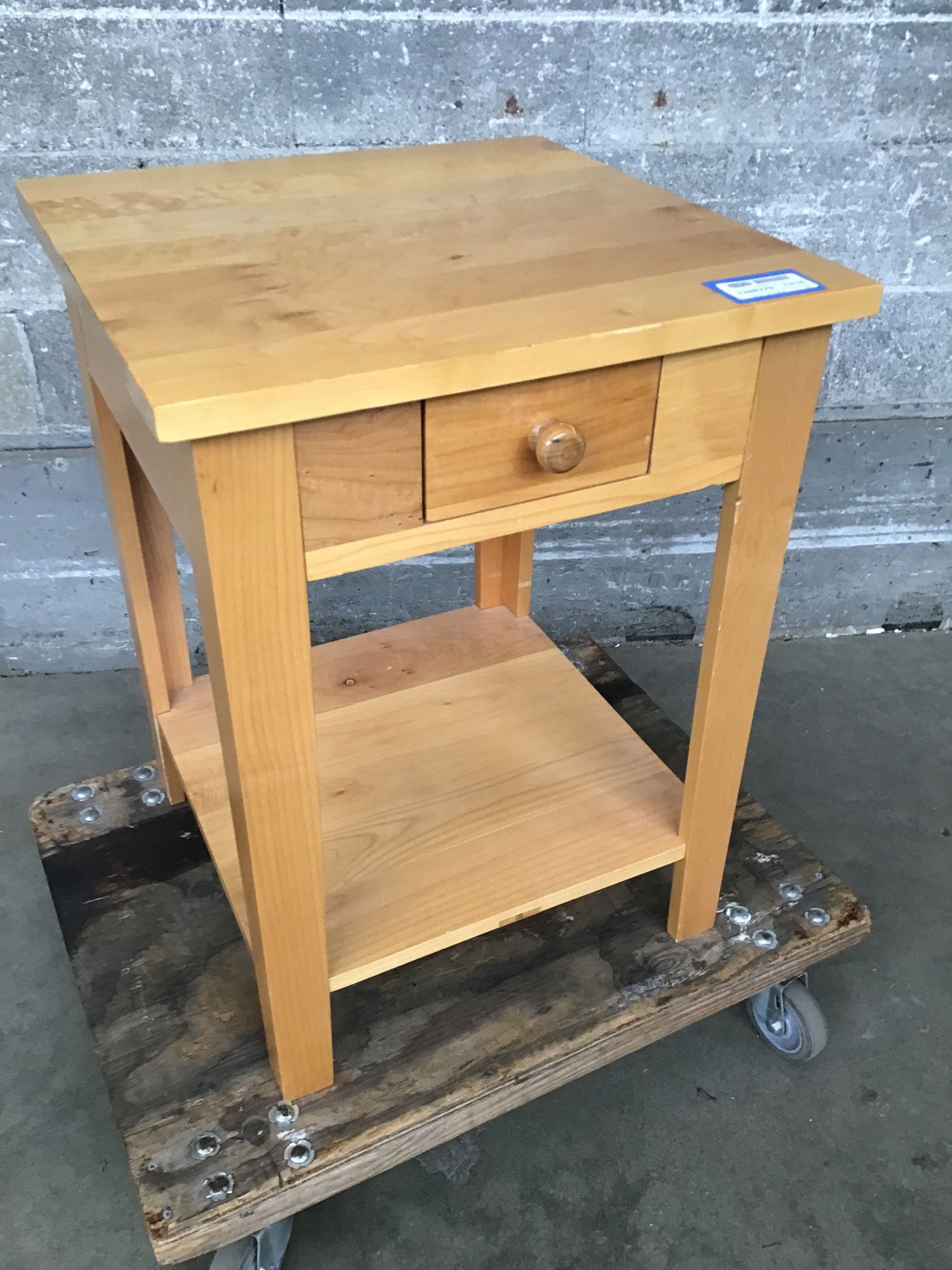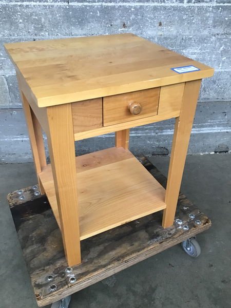 Solid maple side table with a drawer and a light stain finish. Has a few dings, but overall in good condition.