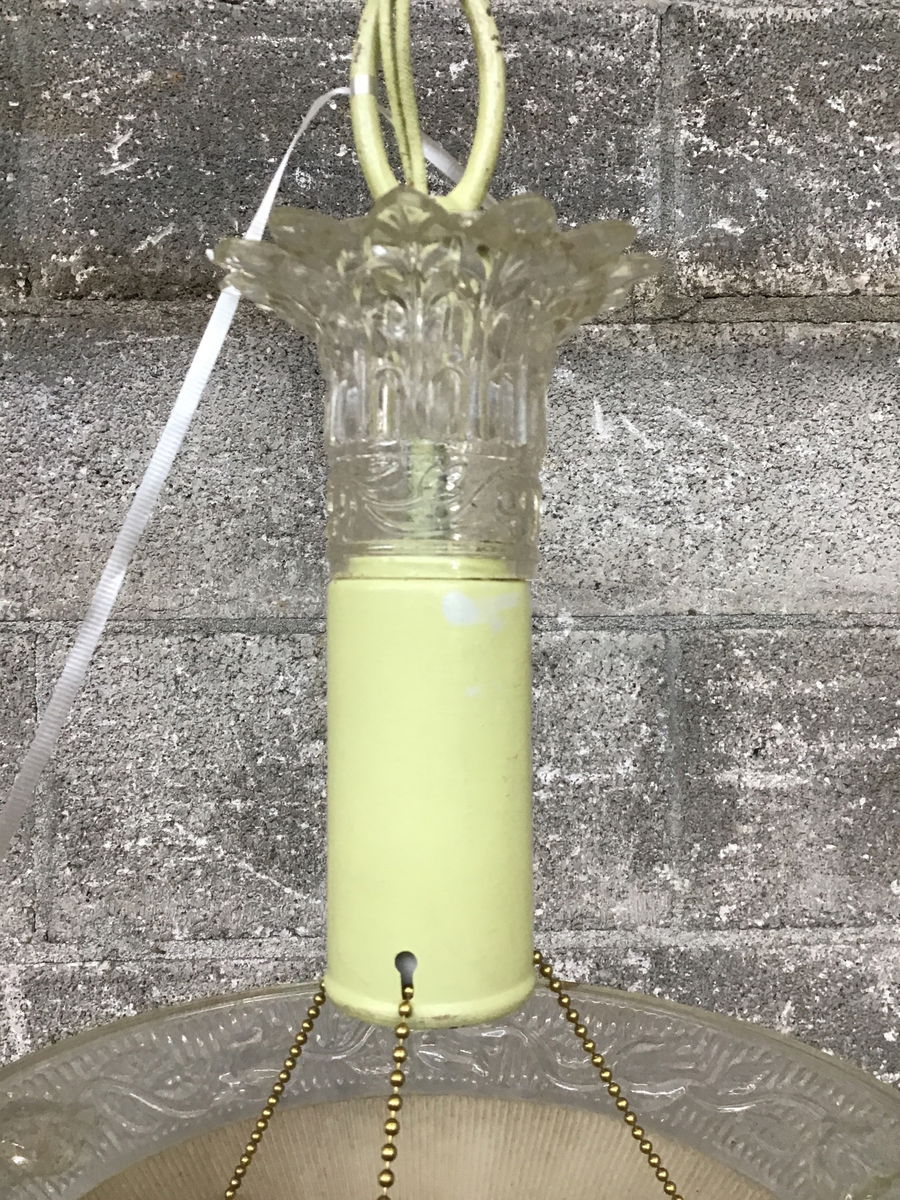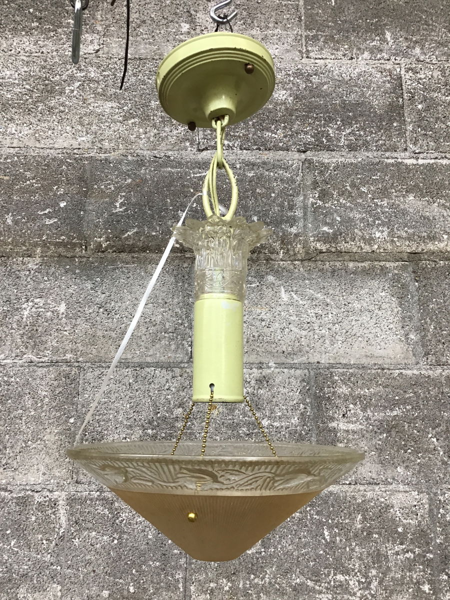 Charming light fixture with a greenish paint job and a light pink shade that's not original, but we think it looks purdy! Also features a leafy decorative glass spacer between the fixture and chain.