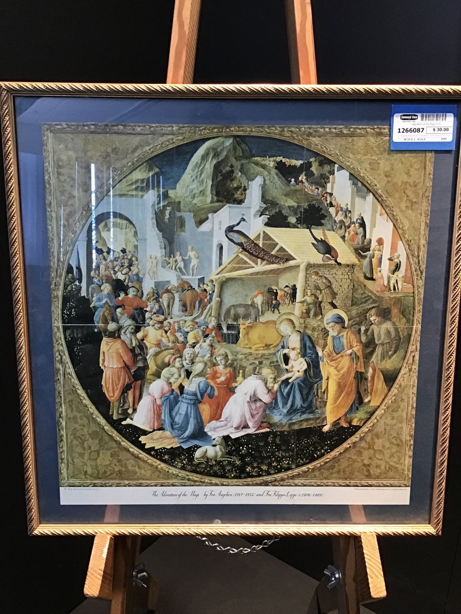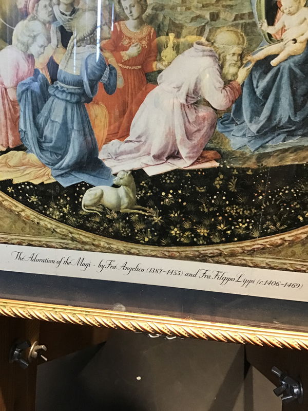 Gold framed print of "The Adoration of the Magi" by Fra Angelico and Fillipo Lippi. This print a folded insert from a 1952 copy of National Geographic. In great condition and framed beautifully. Dated in the lower left hand corner.