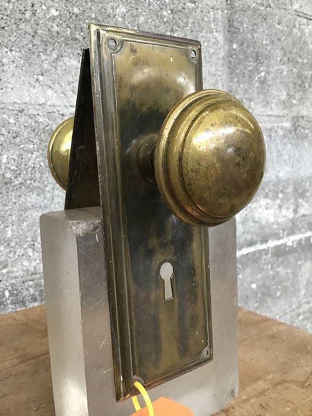 Vintage stamped brass knobset with simple lines and a charming patina. Includes two knobs, spindle, set screws and matching escutcheons. Listed dimensions are for one escutcheon. Cleaned up in house.