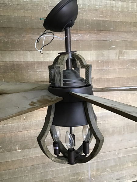 Tavern-style ceiling fan with rustic wood grain finish blades and frame