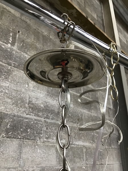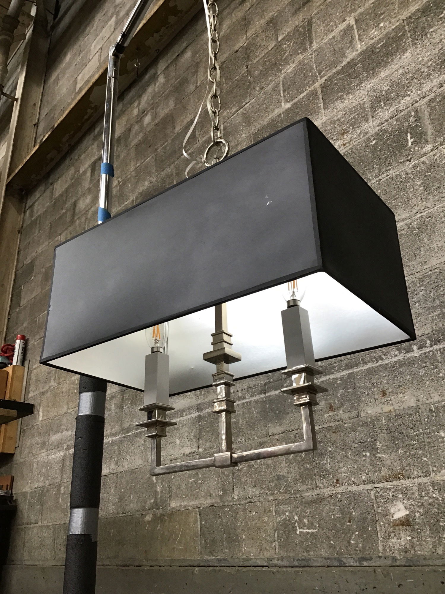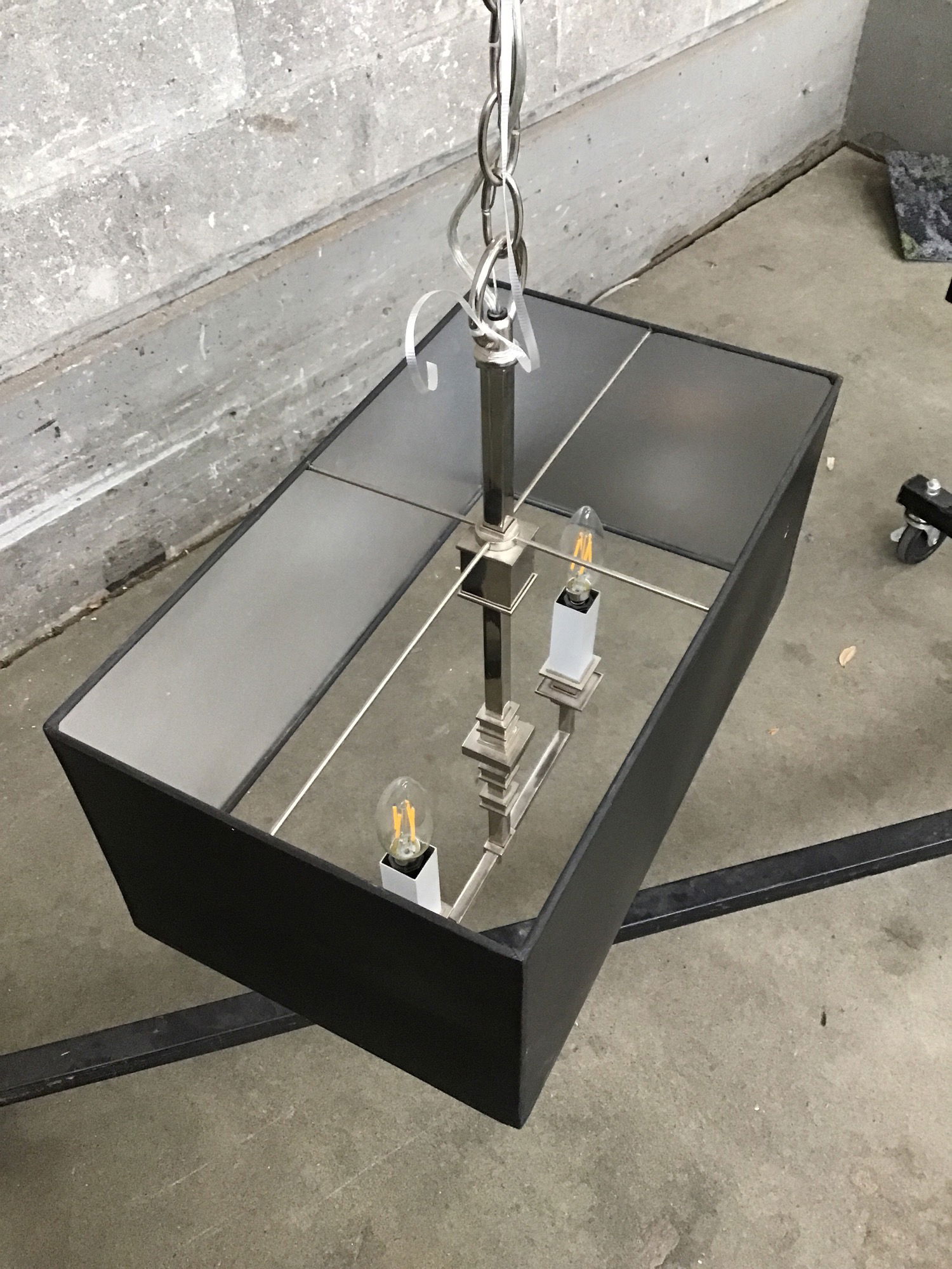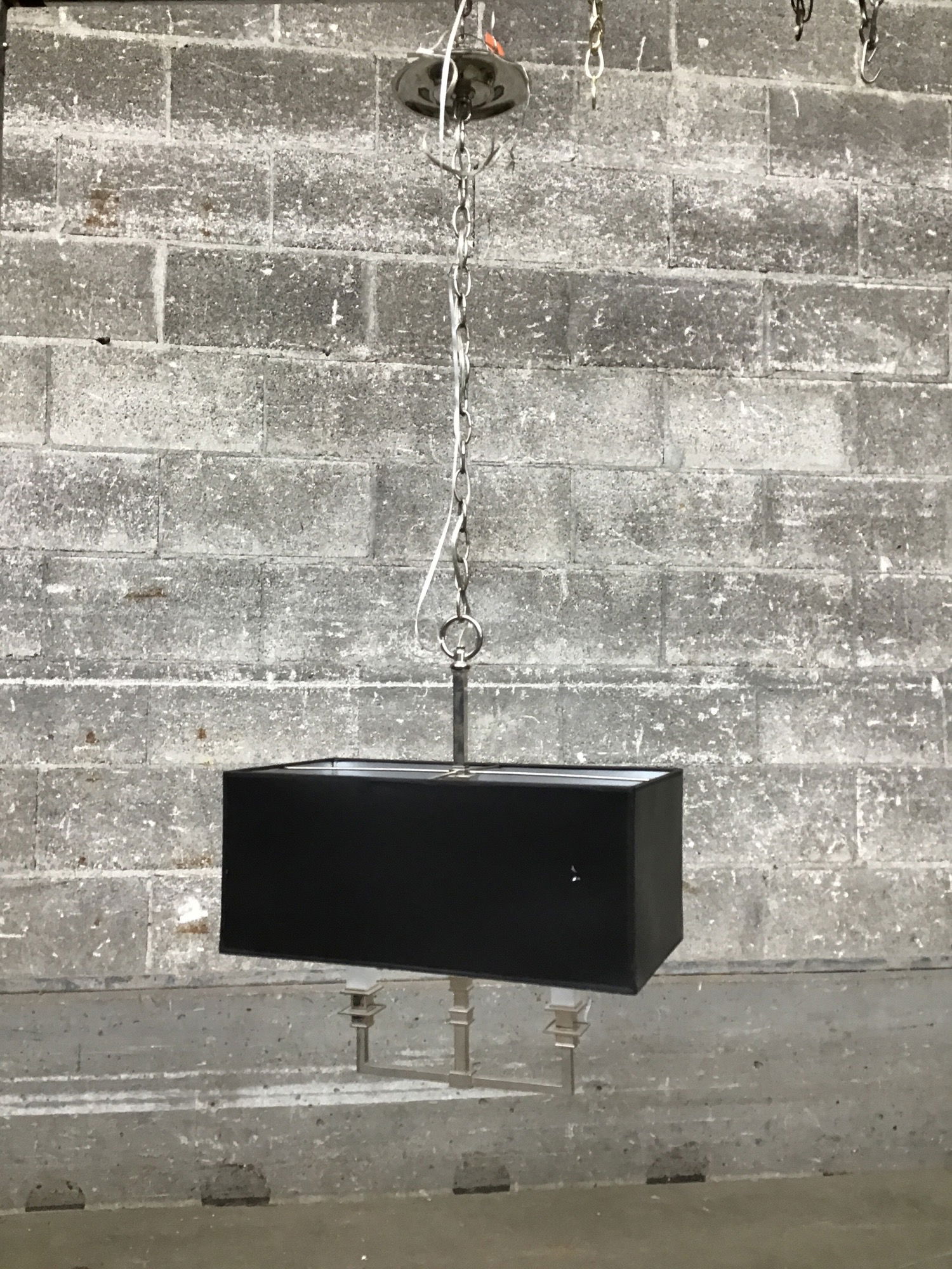 Ca. 2015 two bulb chain pendant light with black shade. Made by The Urban Electric Co. (No. 0215-0129) with a shiny chrome finish. Labeled "Suitable for Damp Locations." Current lighting from Urban Electric is WAY expensive. It looks to be of good quality. Photo may be representative.