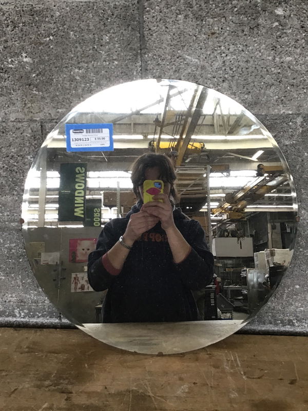 Vintage round mirror with an MDF backing. Mirror has no chips and only very minor wear in a couple spots.