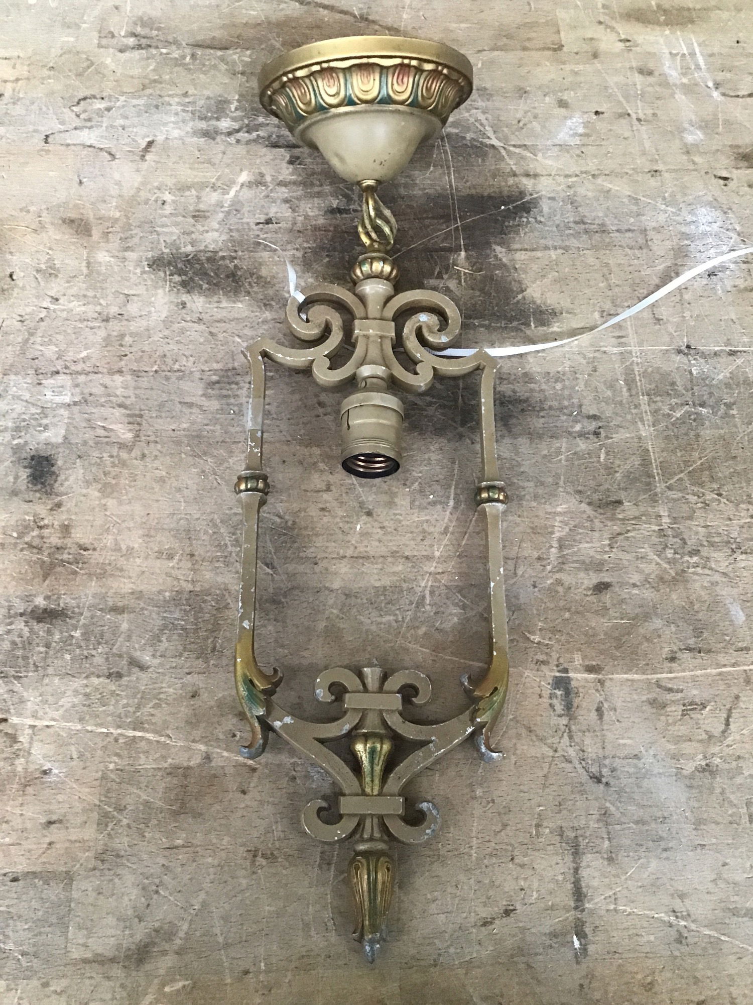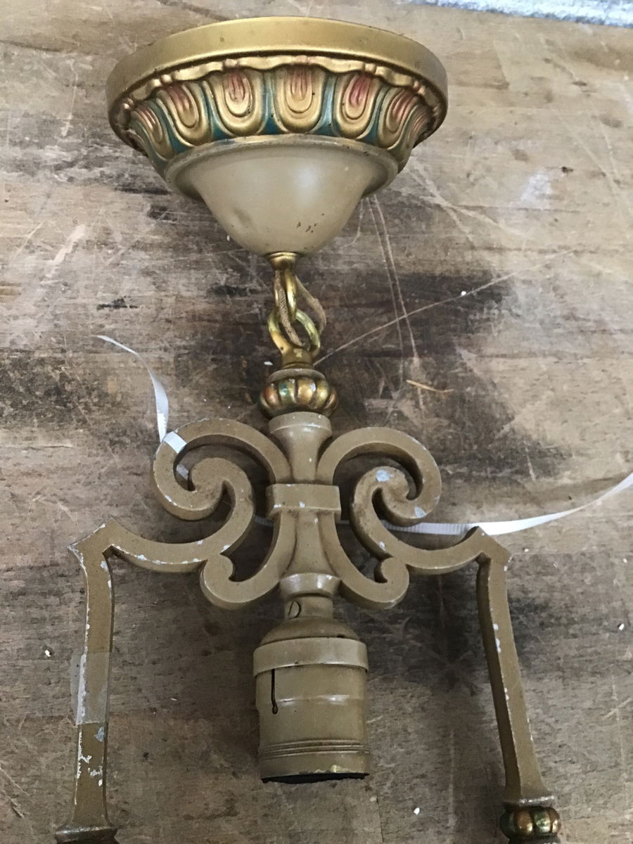 This little beauty is full of Art Deco flair! Its polychrome is brighter than most we see here, and its swirling designs will make a great addition to your space. Probably needs rewiring, but that's what our Lighting Services are for!
