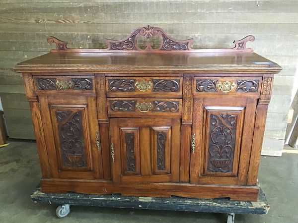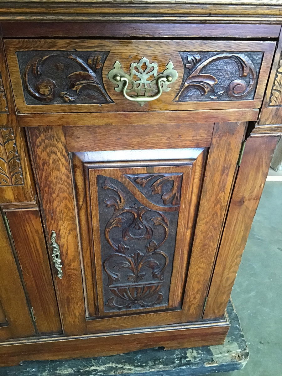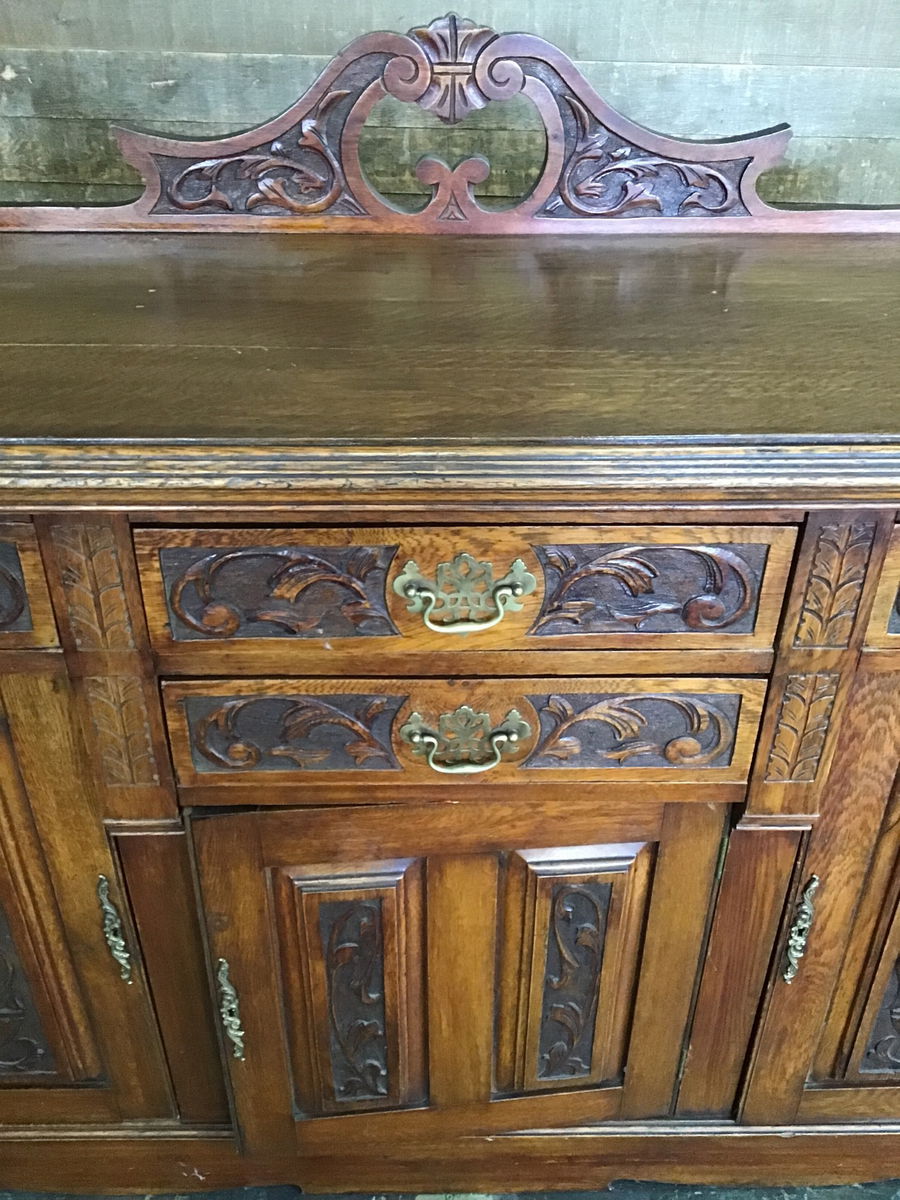 Very nice 1950's Renaissance-Revival carved Oak buffet with brass hardware. This piece has wonderful carved panels and a rich stain.