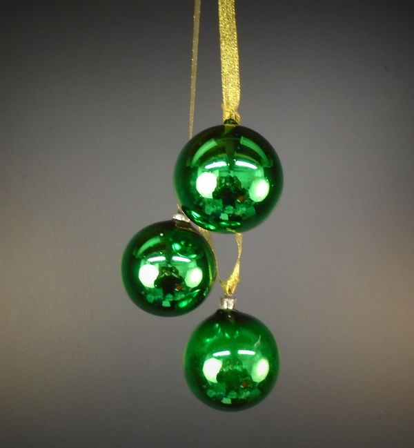 A set of three vintage green mercury glass Christmas ornaments made in Japan in the late 40s-early 50s. They show their age and one is missing it's cap.