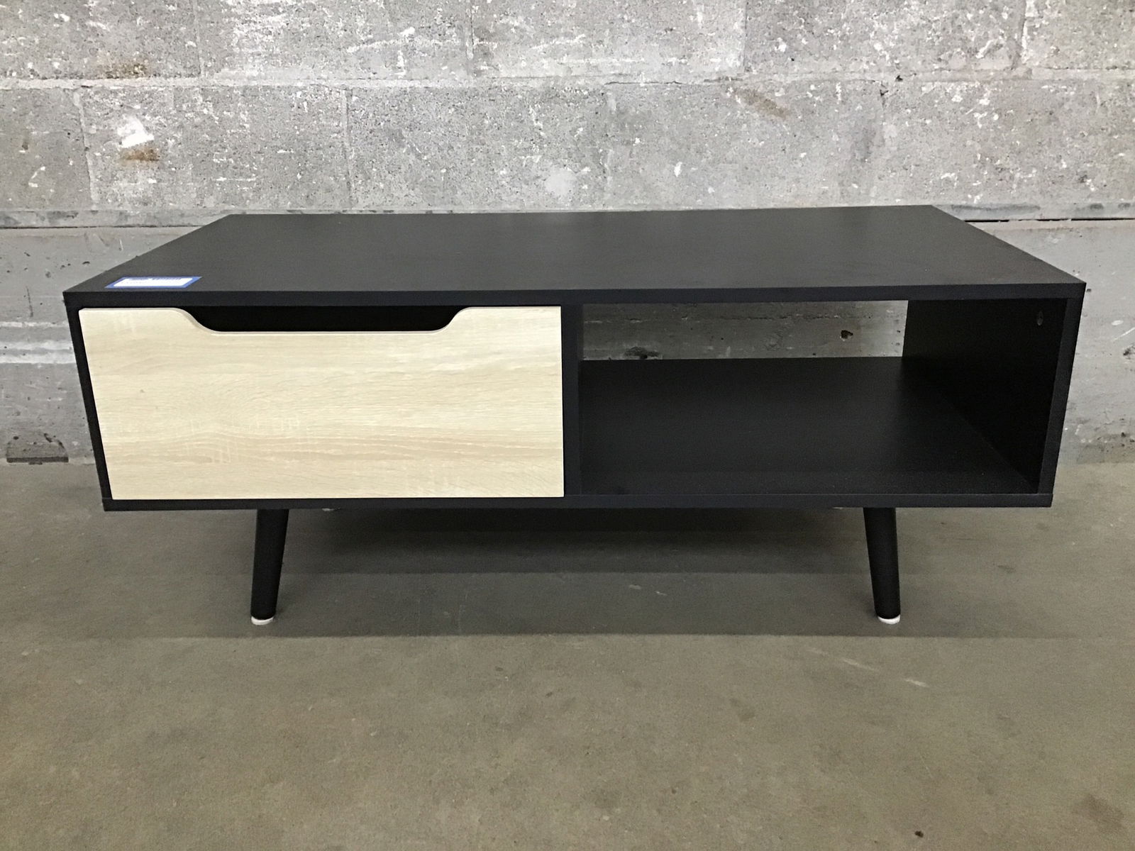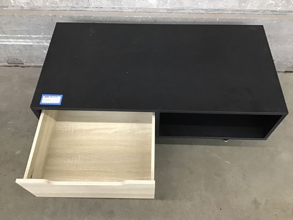 Modern low table with a double-sized drawer on one end and open shelf on the other.