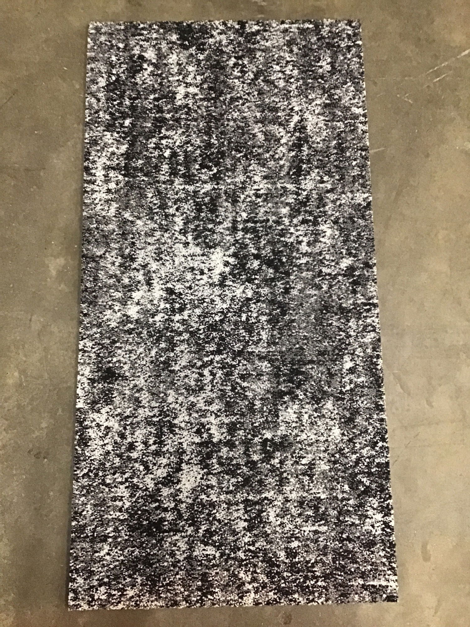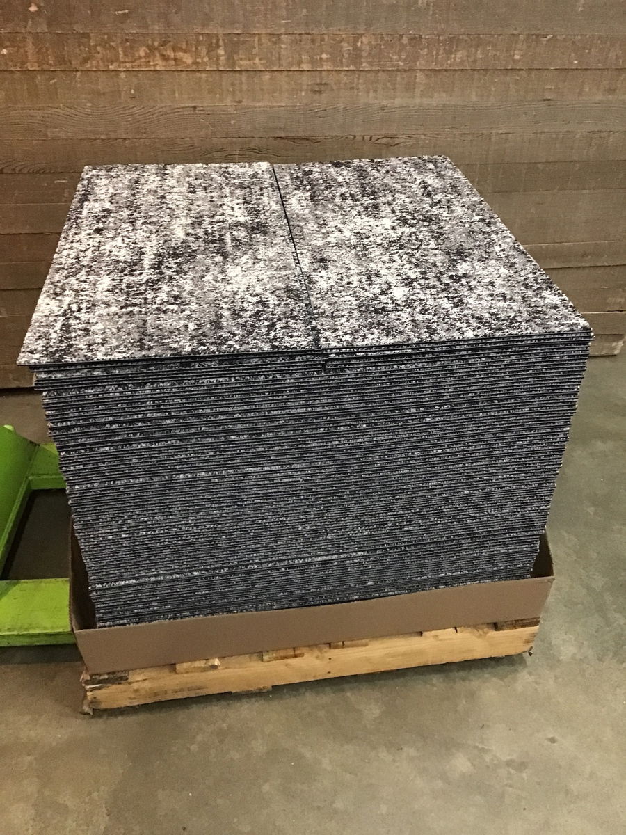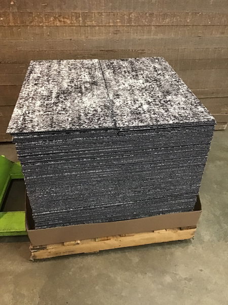 New, U.S. made Bently carpet tile. 36" x 18" rectangular carpet tile in a grayscale color called "Course of Action Noir Creme". Sold by the tile. This is a bulk item, no holds please. Photo may be representational.
