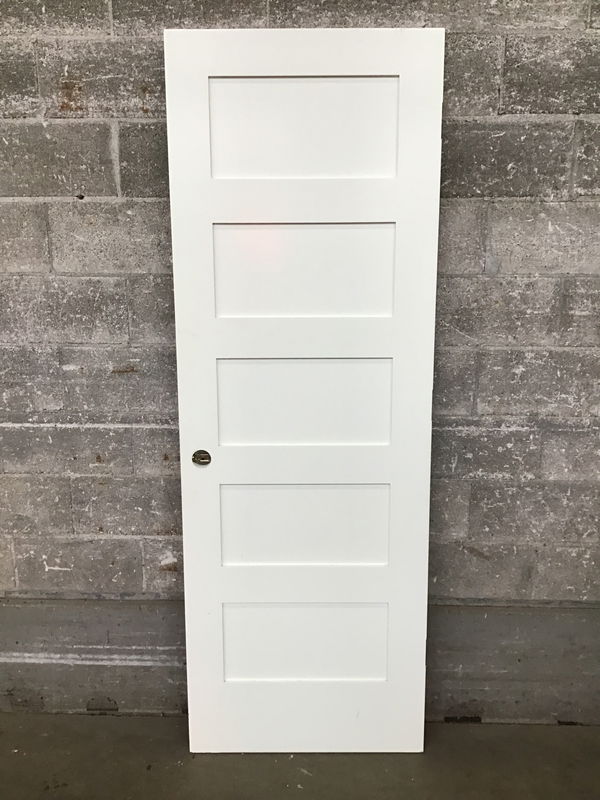 Primed wood Shaker-style panel door with Masonite veneer, in good condition.