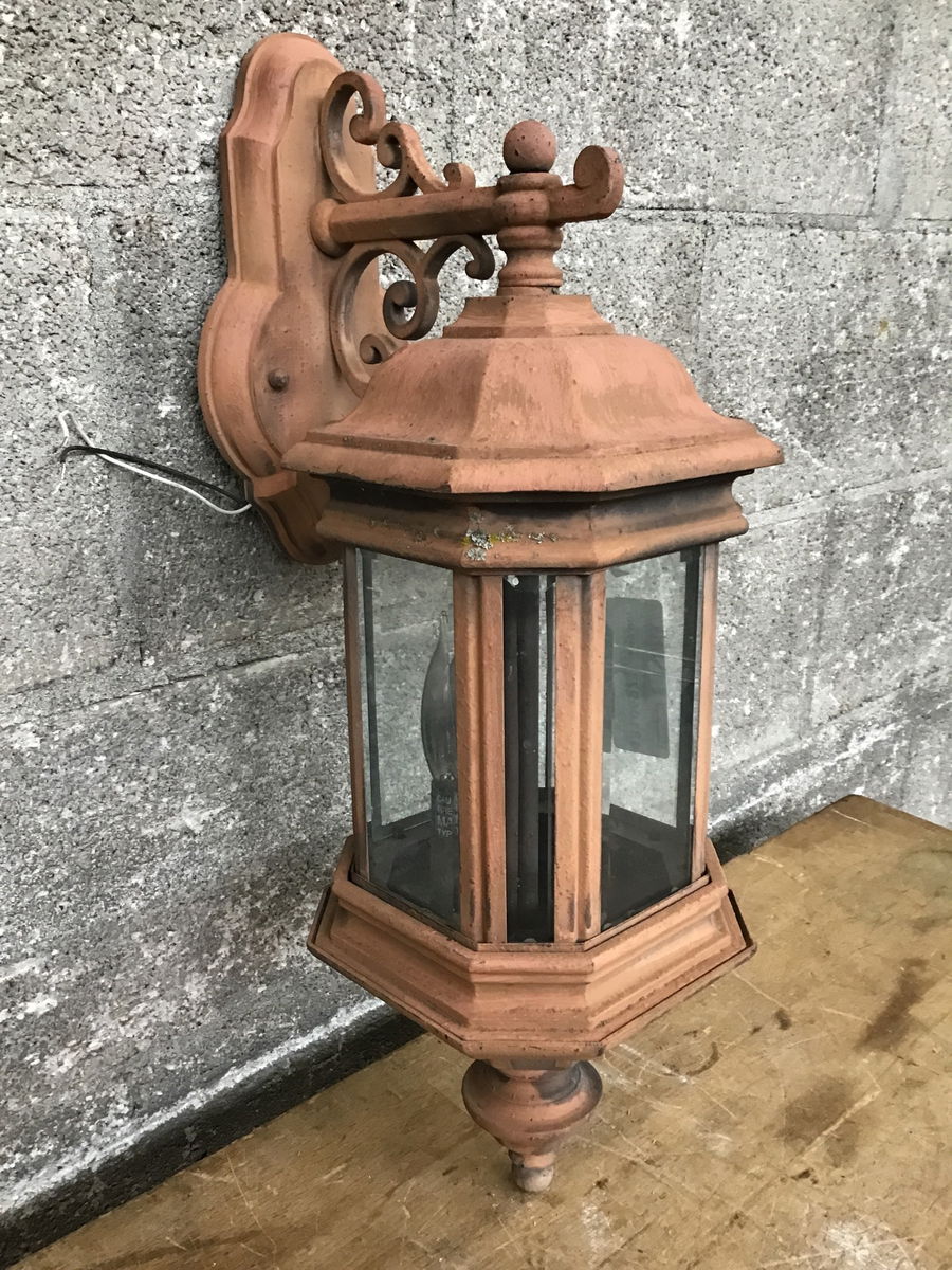 Lantern style outdoor wall sconce with beveled glass. Suitable for wet locations. Includes mounting bracket.