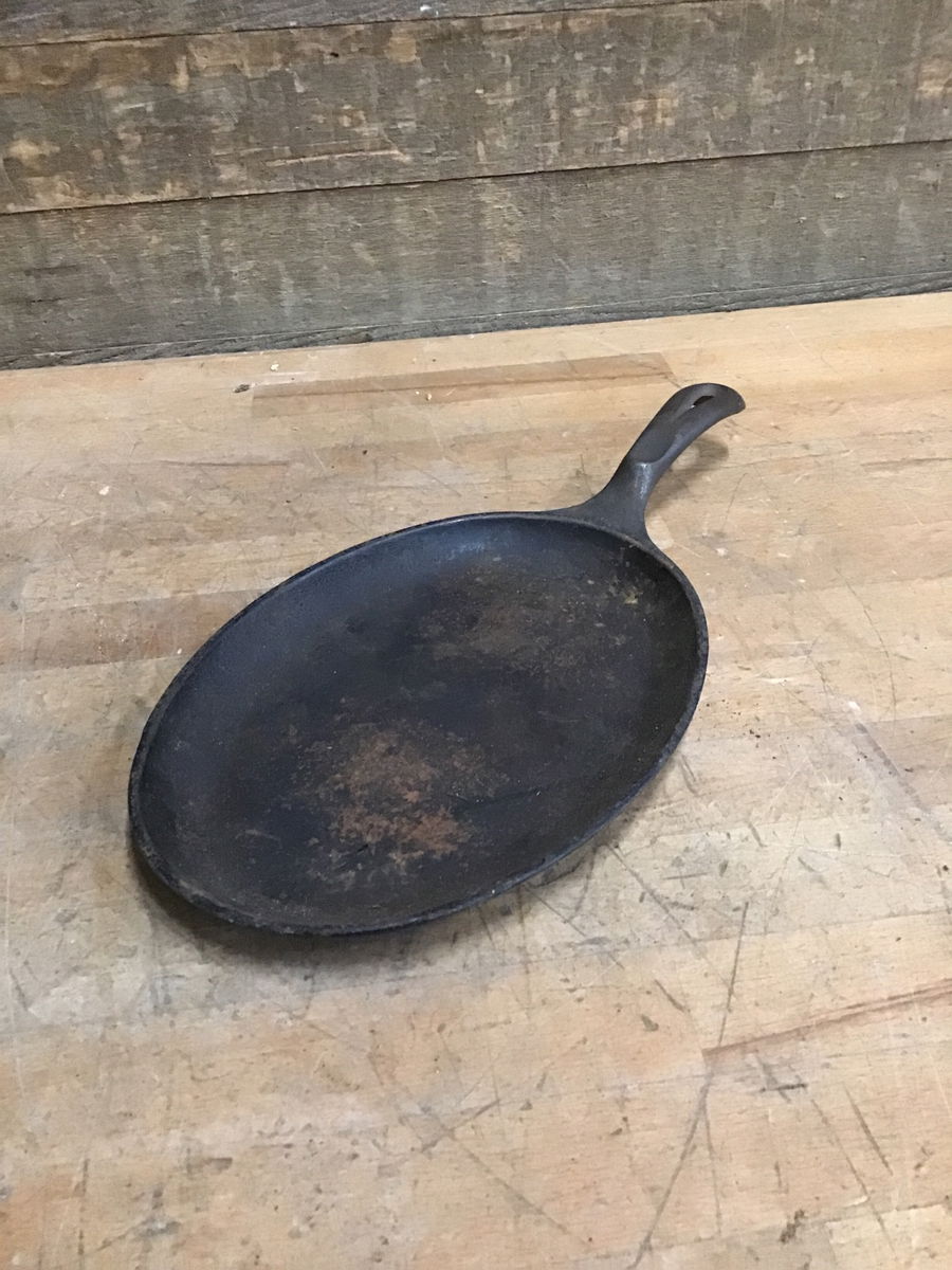 Vintage cast iron oval skillet. Couldn't find the brand but engraving on the bottom reads "sizzle server, made in u.s.a." Real rusty and old but would made some great decor still.