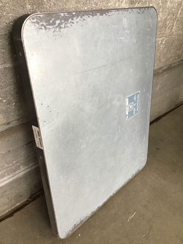 This cafe table top came to us authentically used in a cafe but with it's thick press board and steel wrapped construction, it's got years of work left in it.