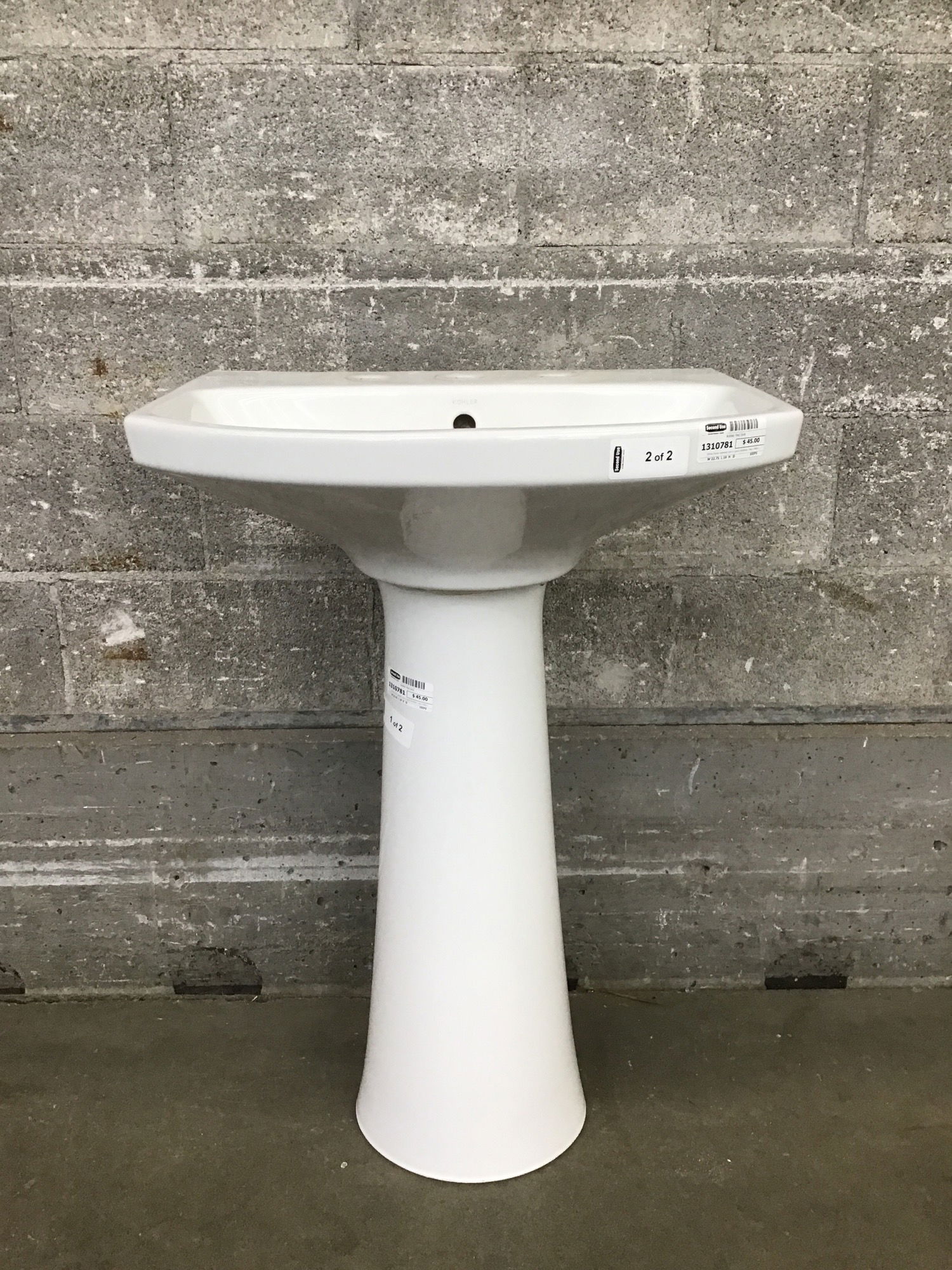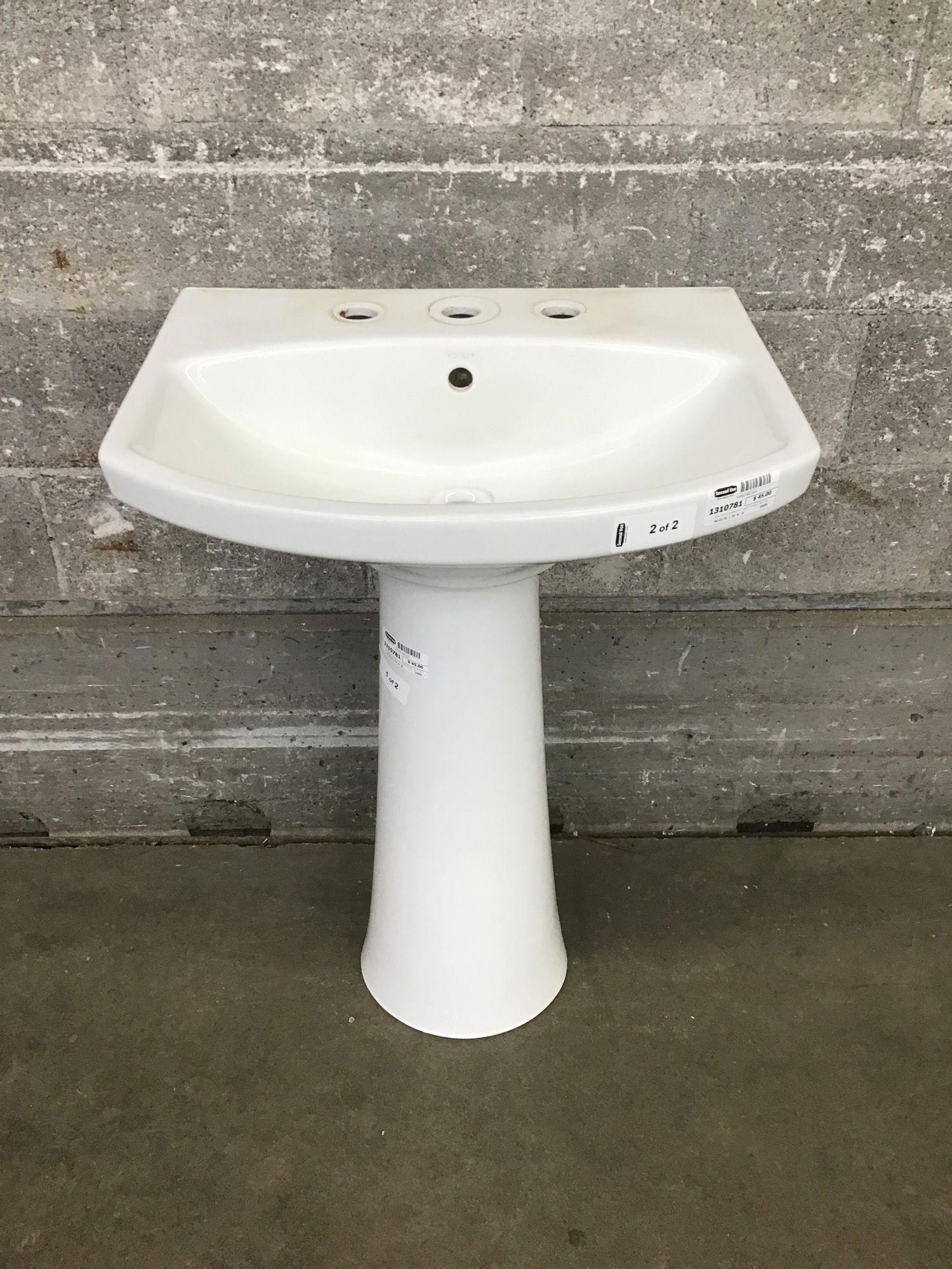 White Kohler pedestal sink in good condition. Has a little bit of paint on the side to scrub off before install but is damage free overall.