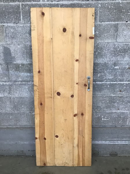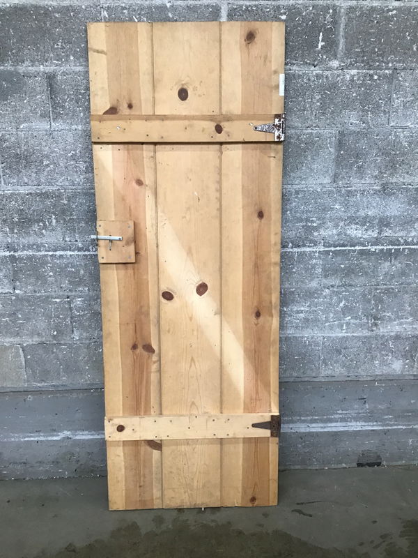 Well made little knotty pine shed door with strap hinges and surface mount hand latch installed.