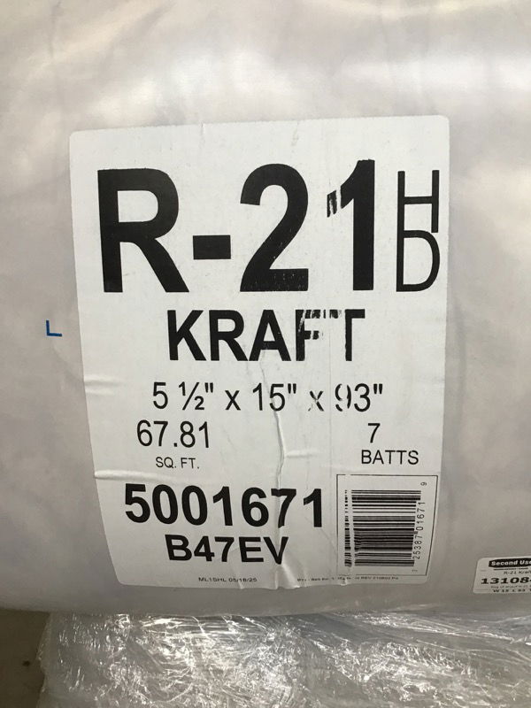 Bag of Knauf R-21 Kraft faced insulation for 2x6 stud wall cavity. Each bag has seven batts and covers 67.81 square feet. Sells for $85.69 per bag at HD. Photo may be representational.