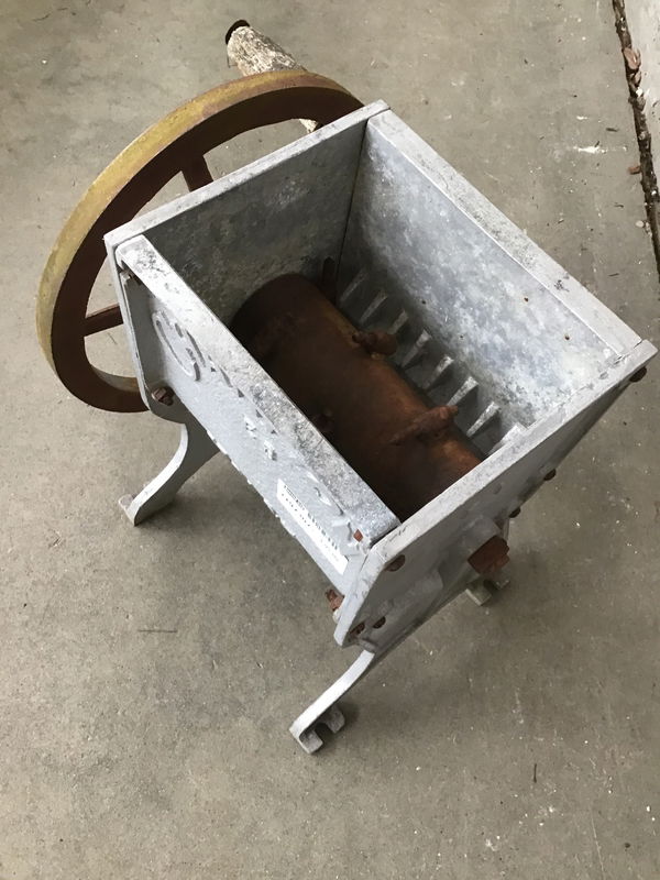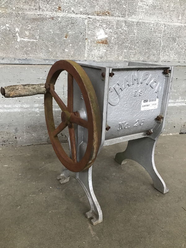 Constructed of cast aluminum with a steel grinder and wheel, this vintage coal crusher has still got it! It operates (with some squeaking) and the grinding pins are quite sharp. It's stamped "Champion No. 25" and has a metal tag identifying it as former property of the US government.