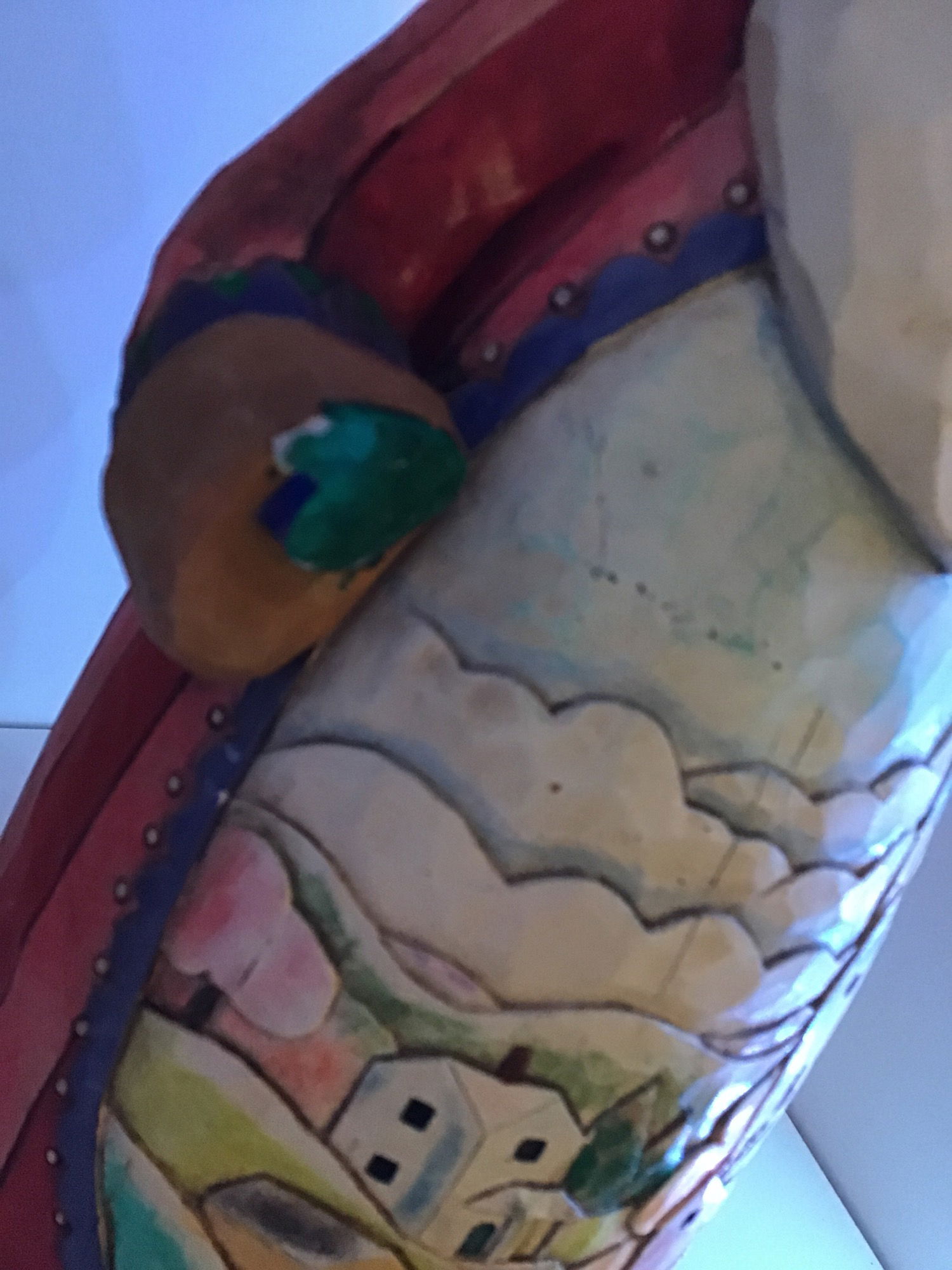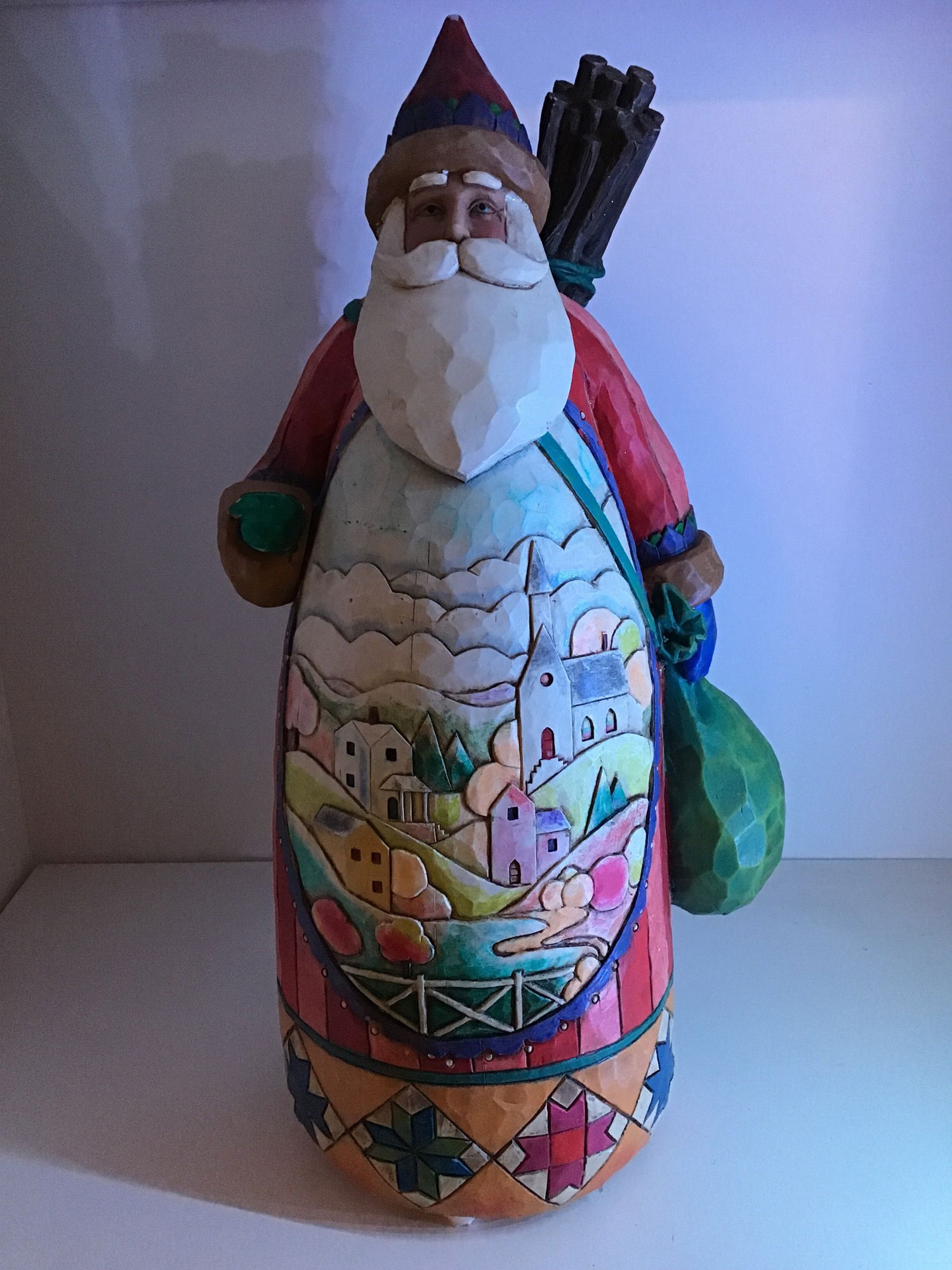 Jim Shore is a highly collectible artist and designer who has many, many figurines that collectors fawn over. This is a Jim Shore collectible Santa titled "God's Blessings Are Forever." However they aren't really forever because this figurine has lost a hand. Beautifully colored hand carved figurine with a lovely town on Santa's belly, also plays "O Come All Ye Faithful" when bottom crank is turned.