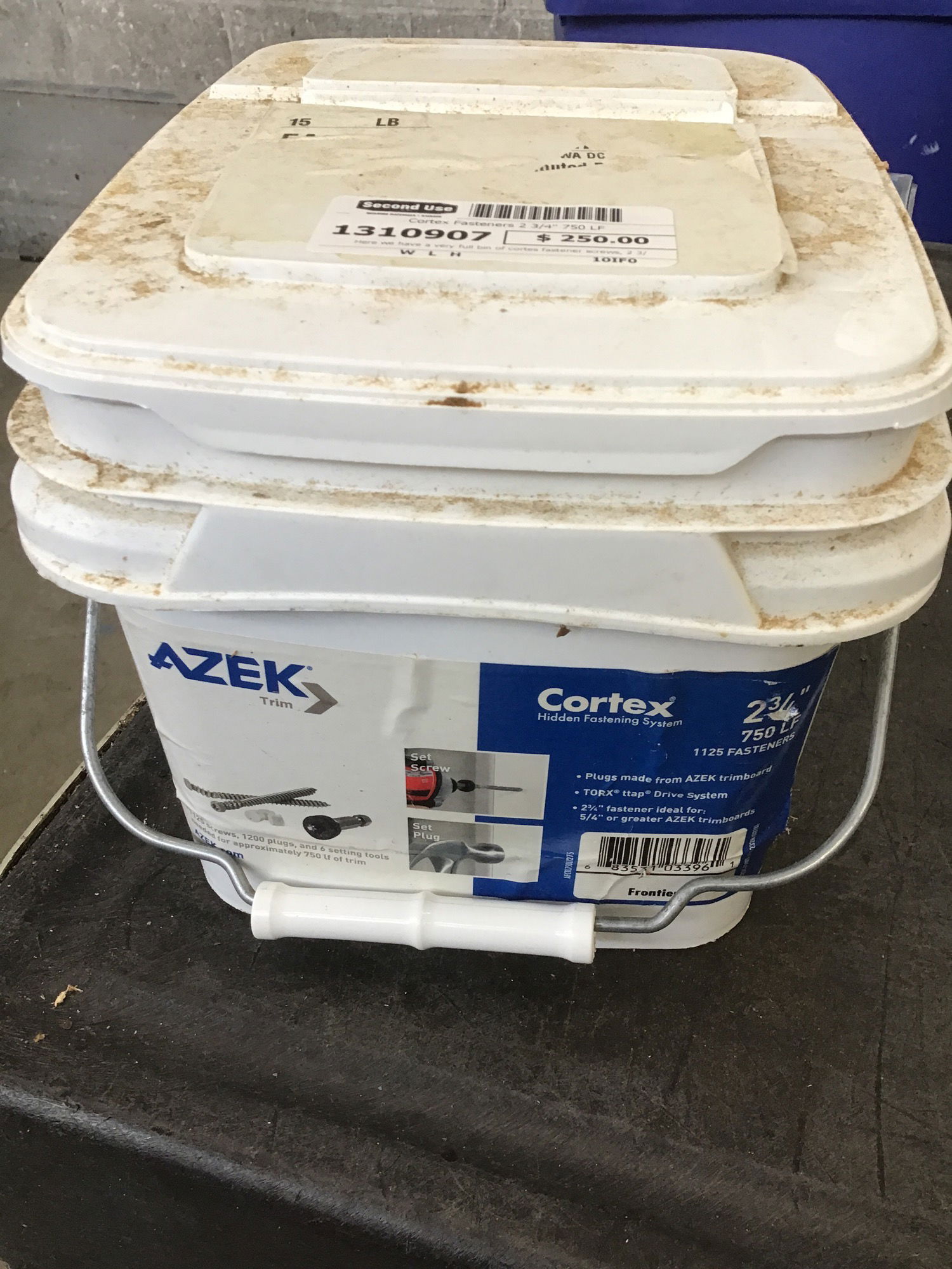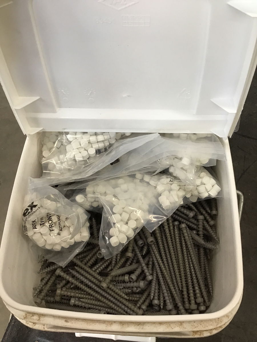 Here we have a very full bin of Cortex fastener screws, 2 3/4", 750 LF, approx 1125 fasteners with accompanying white plugs. Seems to regularly retail brand new for $500.00.