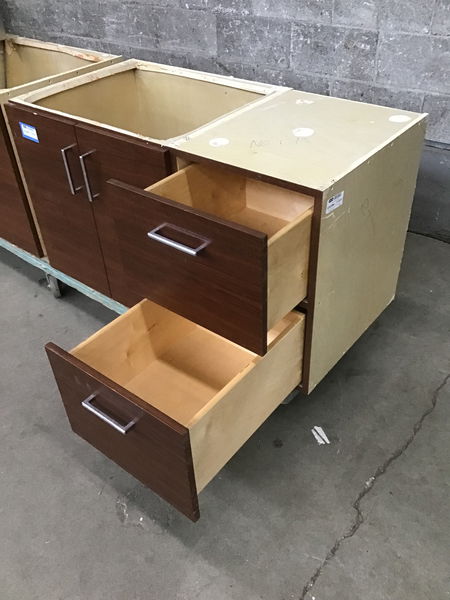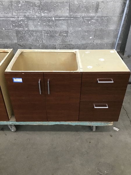 Really nice looking, medium/dark stained flush face oak vanity sink base cabinet constructed with a plywood cabinet box. I'd guess (from the height) that this cabinet hung on the wall, but it could have a tall toe kick or legs put underneath it (not included). Neither side is finished.