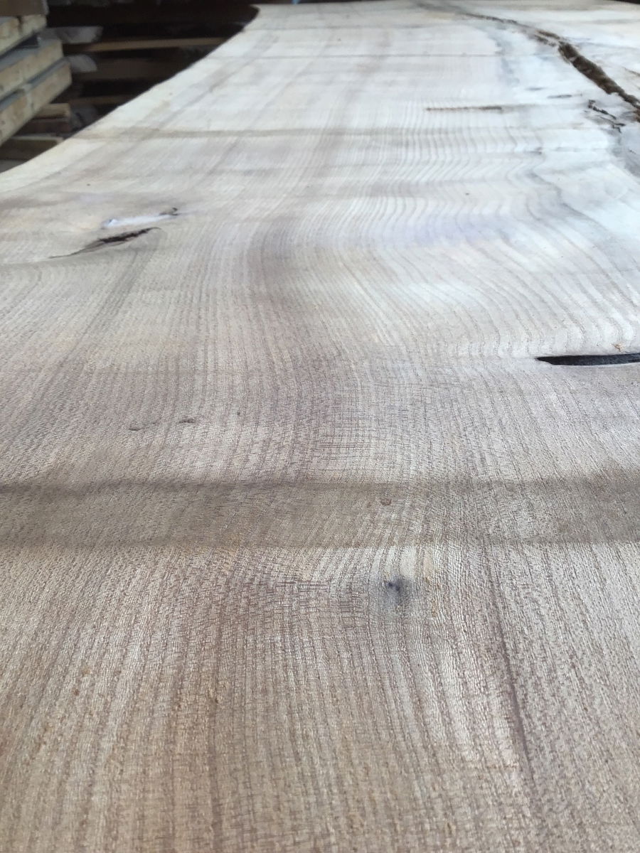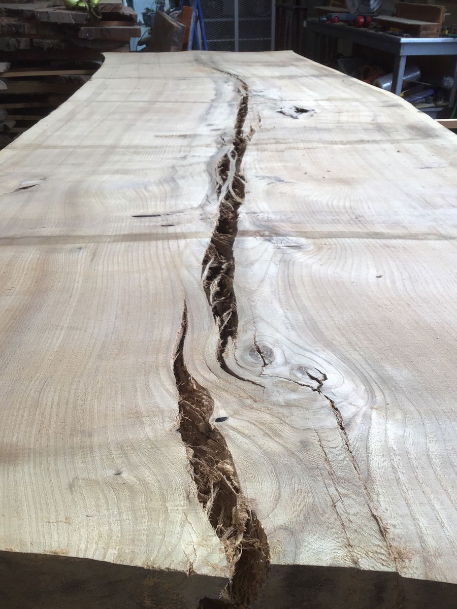 Locally milled and kiln dried. This giant slab came from a humongous English Elm tree that was taken down in Capital Hill over ten years ago and has been slowly curing since then. It was recently put into a kin to ensure any critters were nuked. It has significant checking down the center, but is still one solid slab. Is very flat for an unsurfaced slab, would lose very little thickness in leveling. Would be a great candidate for some resin river work. Tapers in width from 41" to 46"