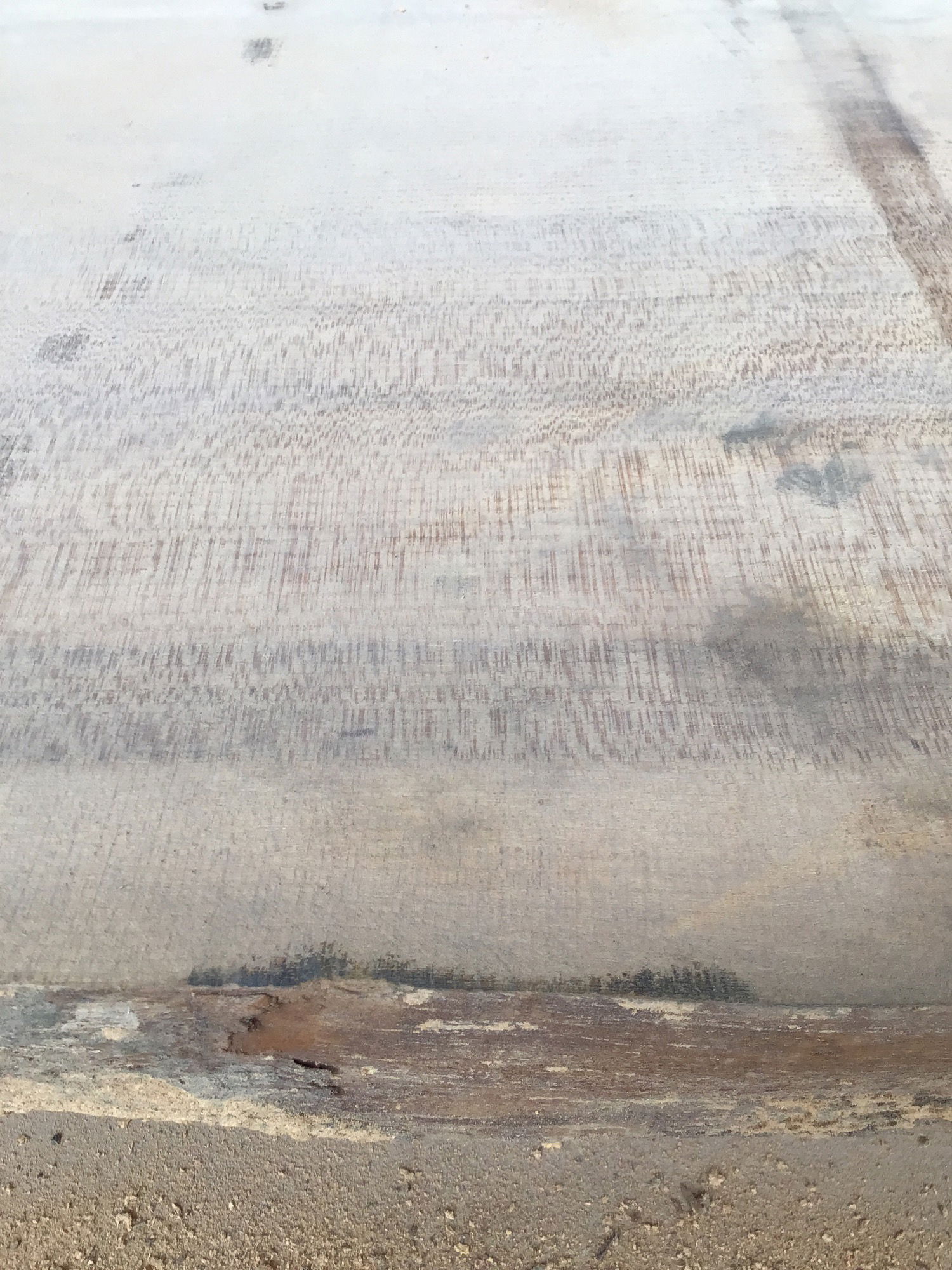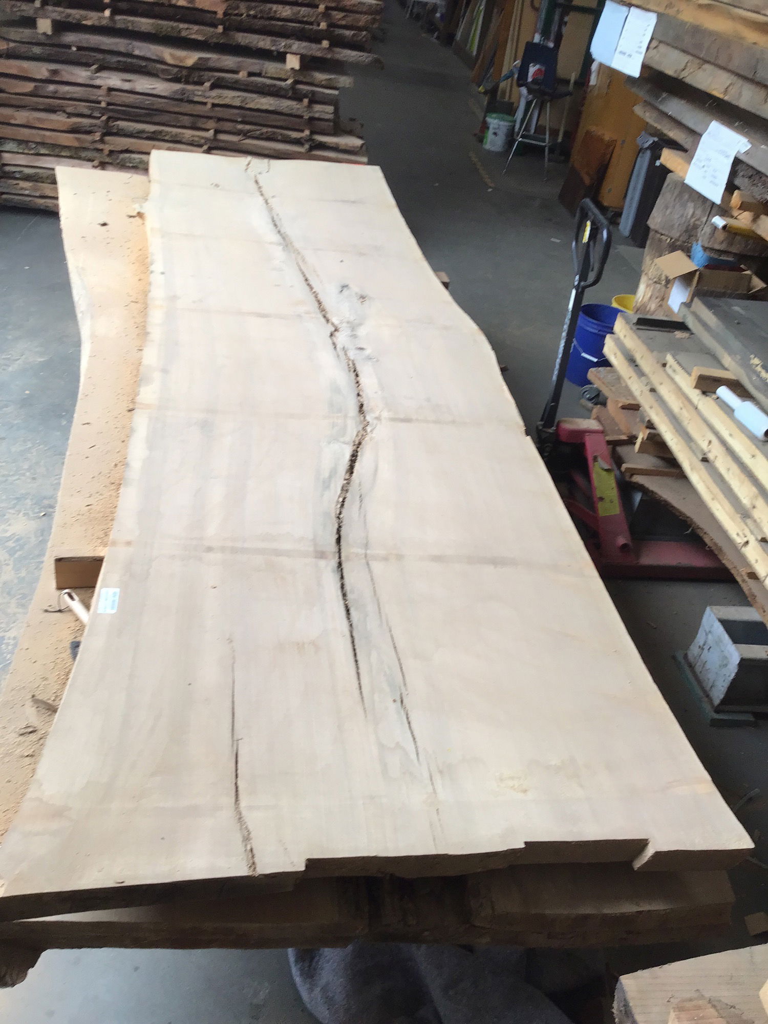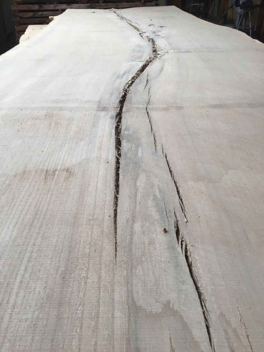 Locally milled and kiln dried. This giant slab came from a humongous English Elm tree that was taken down in Capital Hill over ten years ago and has been slowly curing since then. It was recently put into a kin to ensure any critters were nuked. It has significant checking down the center, but is still one solid slab. Is very flat for an unsurfaced slab, would lose very little thickness in leveling. Would be a great candidate for some resin river work. Tapers in width from 41" to 46" Has a chunk of metal 17" in on the narrow end, can be drilled out or just shorten the slab down to 10ft long.