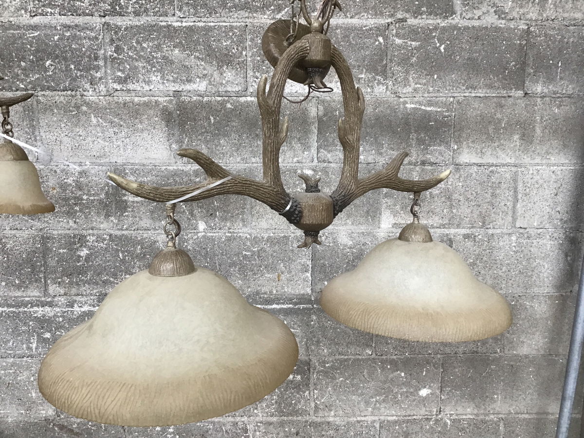 This light is quite interesting and would be a perfect fit in a rustic cabin, den, or even the garage. Features two cream colored, semitransparent shades that hang from faux resin antlers.