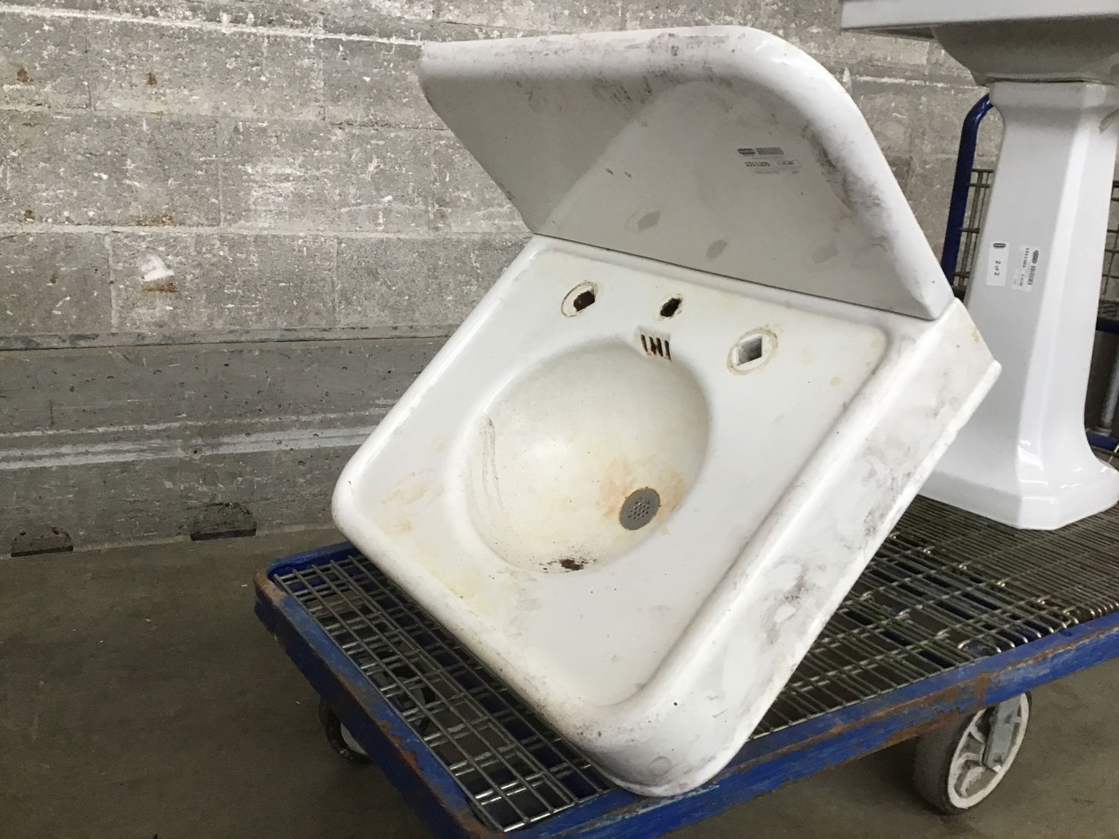 This LARGE white porcelain over cast iron wall hung bathroom sink is probably past its prime as a lav sink, but it could make a wonderful fountain or planter. Height listed is to top of the backsplash.