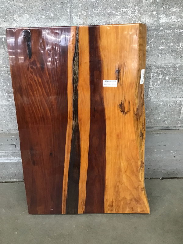 Was made by a local wood artisan as the countertop in his home. Has an epoxy fill in the voids and a layer on top. The voids have some imperfections that could be repoured. Tapers in width from 28" to 24"