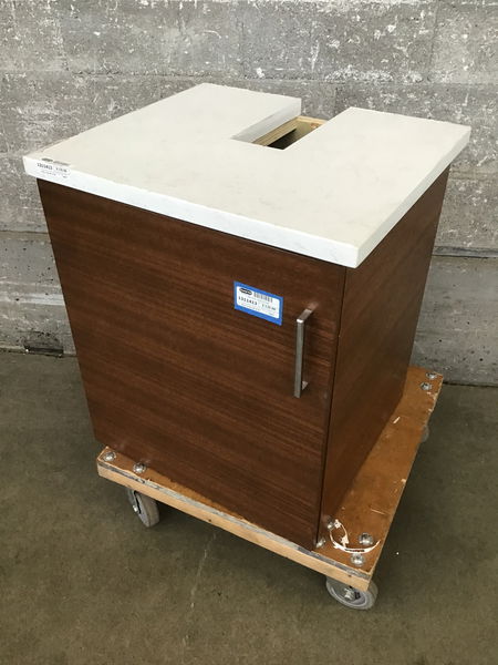 This flush stained oak face vanity once had a vessel or deck mount sink installed. The manmade stone countertop is finished on front and right edge and has a slot cut for the plumbing to go through. I'm guessing it was installed as a floating cabinet with no legs or toe kick, but you could add if desired.